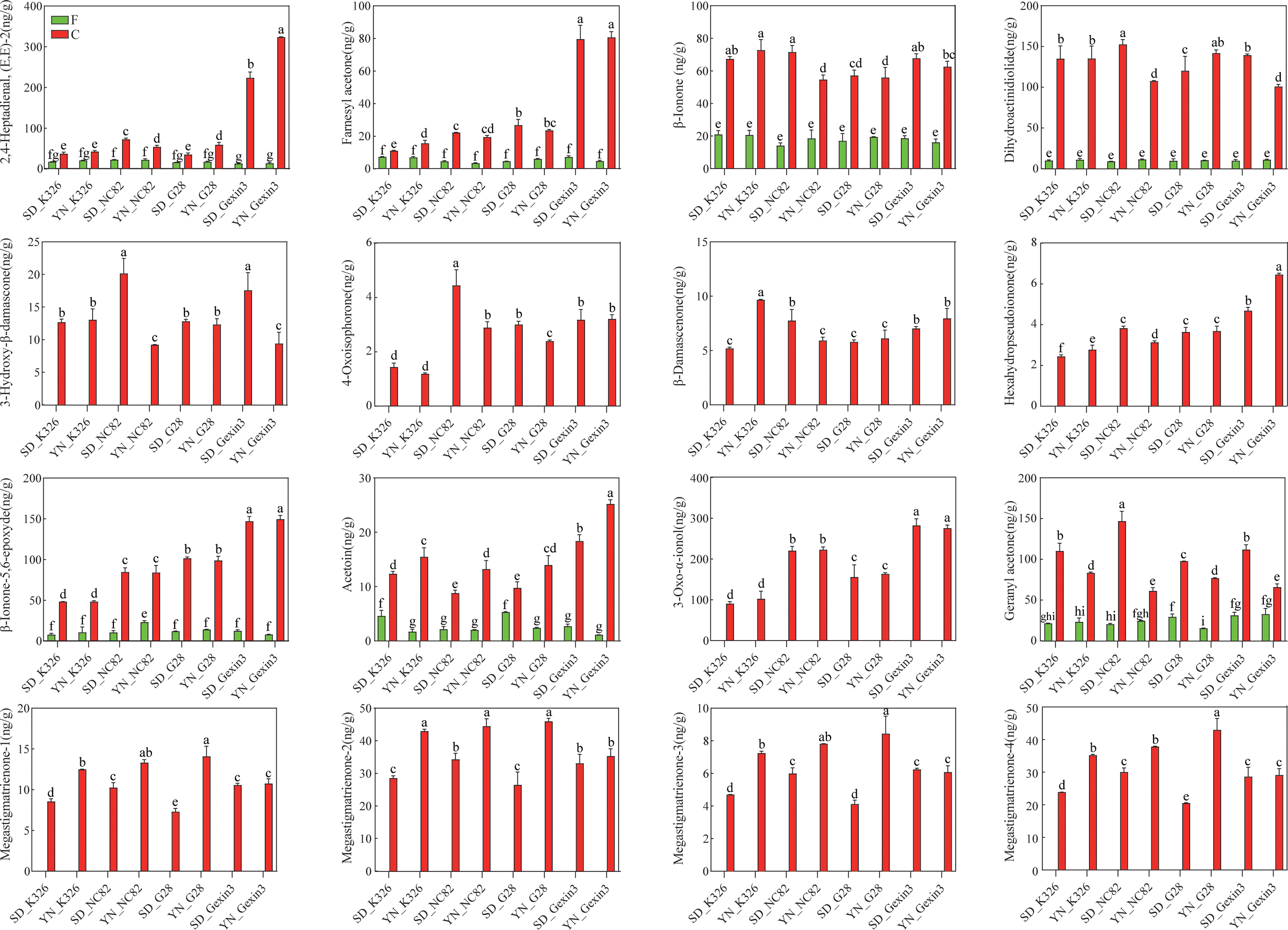 Carotenoid degradation products in fresh (F) and cured (C) tobacco leaves. SD, Shandong; YN, Yunnan. Values labelled with different letters are statistically different from one another using one-way ANOVA (P < 0.05).
