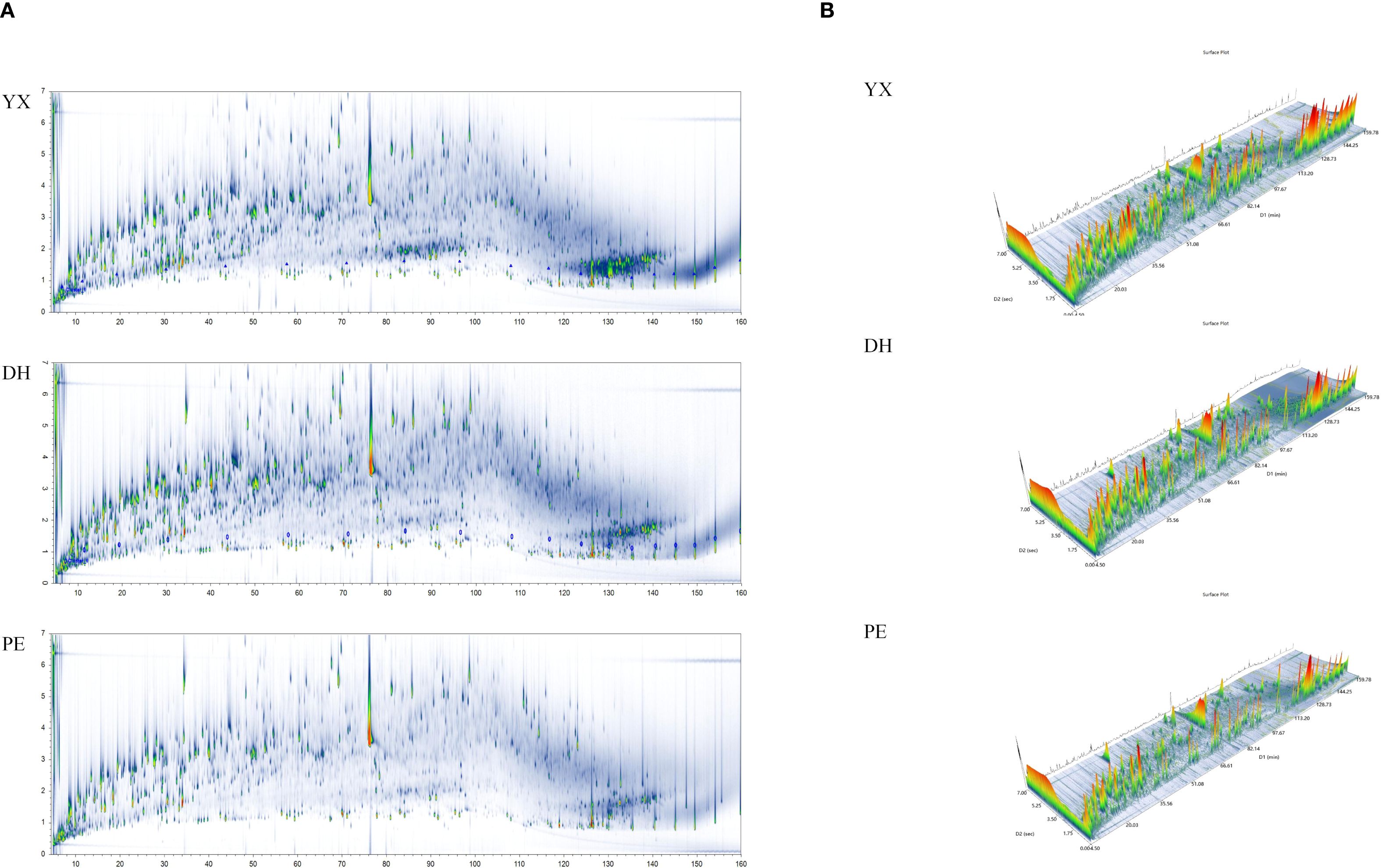 Figure 2. The results of GC×GC-TOFMS of cigar smoke samples from 3 regions in Yunnan (Yuxi, Yunnan, YX; Dehong, Yunnan, DH; Pu’er, Yunnan, PE). (A) The full two-dimensional chromatographic profiles (TIC) of cigar smoke samples (B) The 3D view of the full 2D chromatograms of cigar smoke samples.