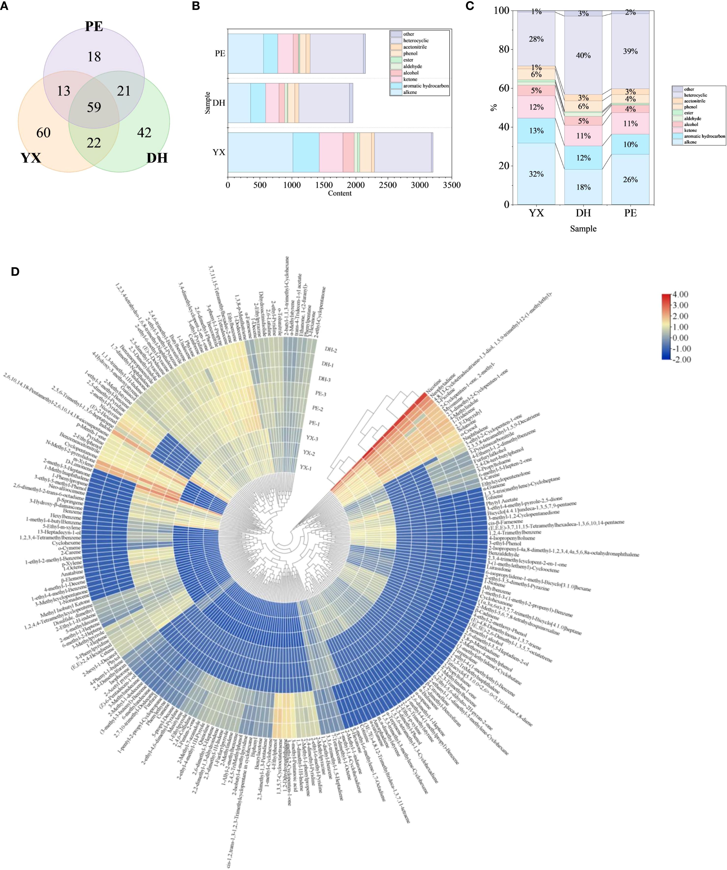 Figure 3. Volatile flavor compounds in cigar smoke samples. (A) Analyzing the similarities and differences of cigar smoke from 3 regions by Venn diagram. (B) The content of various kinds of volatile compounds in 3 cigar smoke samples. (C) Proportion of each kind of volatile compound. (D) The content of volatile compounds in 3 cigar smoke samples.
