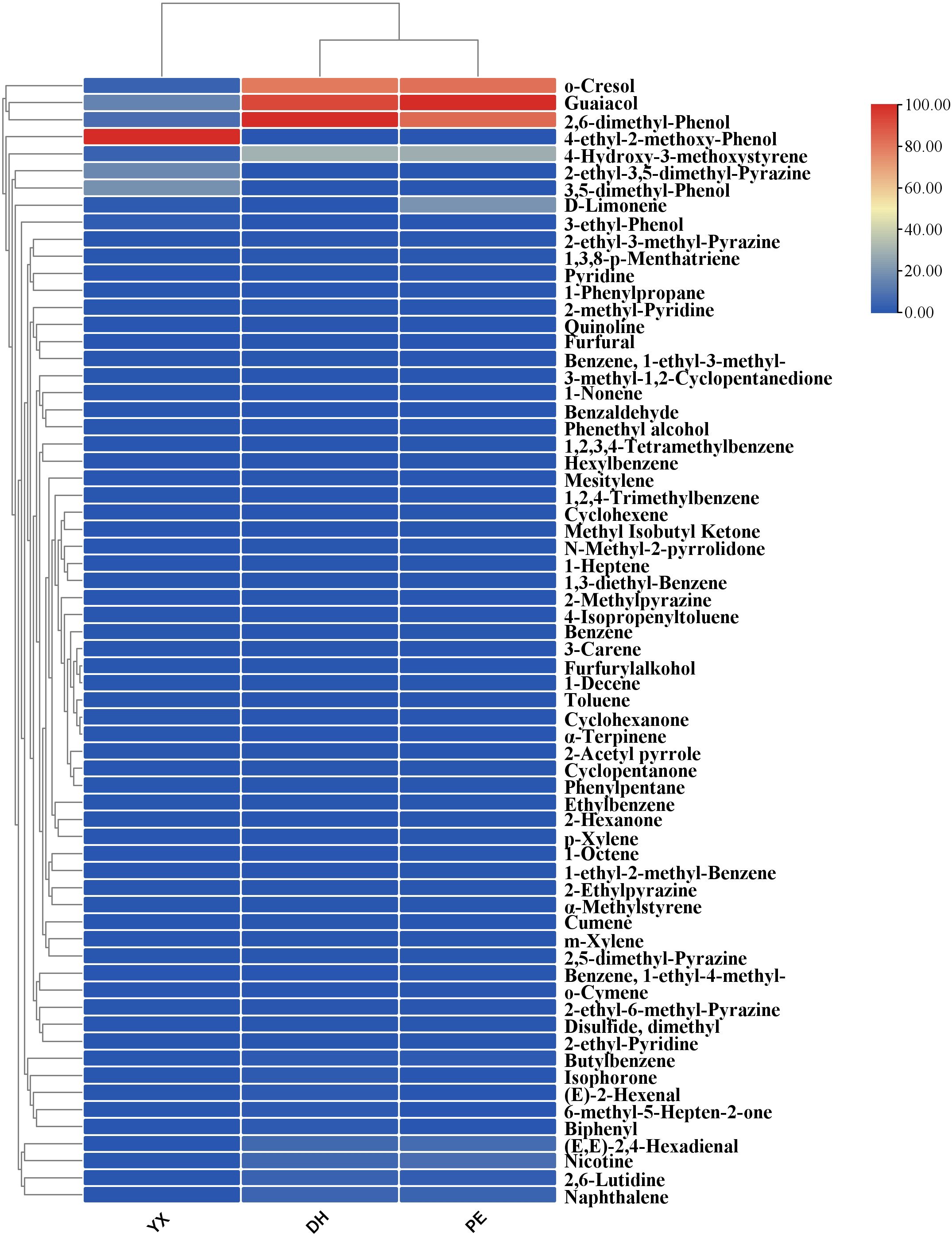 In YX, DH and PE, there were 9,13 and 10 VOCs with ROAV > 1, respectively. o-Cresol, guaiacol, 2,6-dimethyl-phenol, and 4-hydroxy-3-methoxystyrene had ROAVs greater than 1 in cigar smoke samples from all the three regions and might be the key compounds in the generation of the characteristic flavor of cigar smoke. Additionally, (E,E)-2,4-hexadienal, butylbenzene, naphthalene, and nicotine had ROAV > 1 in DH and PE; and D-limonene had ROAV > 1 in YX and PE. These compounds would also like to be a key part of the formation of cigar flavor. 2-Ethyl-3,5-dimethyl-pyrazine, 3-ethyl-phenol, 3,5-dimethyl-phenol and 4-ethyl-2-methoxy-phenol had ROAV > 1 in YX only. (E)-2-Hexenal, 6-methyl-5- hepten-2-one, isophorone and biphenyl had ROAV > 1 in DH only. As the consequence of that, these compounds might be the differential flavor compounds that form the characteristic flavor of cigar smoke in different region. To compare the ROAV of the 3 cigar smoke samples more visually, clustered heat map has been drawn (Figure 4). The cluster analysis indicated that DH and PE were more similar in terms of aroma contribution, which was consistent with the results of the content analysis. From the differences in color, o-cresol, guaiacol, 2,6-dimethyl-phenol and 4-ethyl-2-methoxy-phenol were particularly important for flavor formation in each sample. In summary, the samples from the three regions had commonalities regarding the contribution of each component to the overall flavor. At the same time, there were also differentiating components that could significantly differentiate the flavor of cigar smoke from other regions.