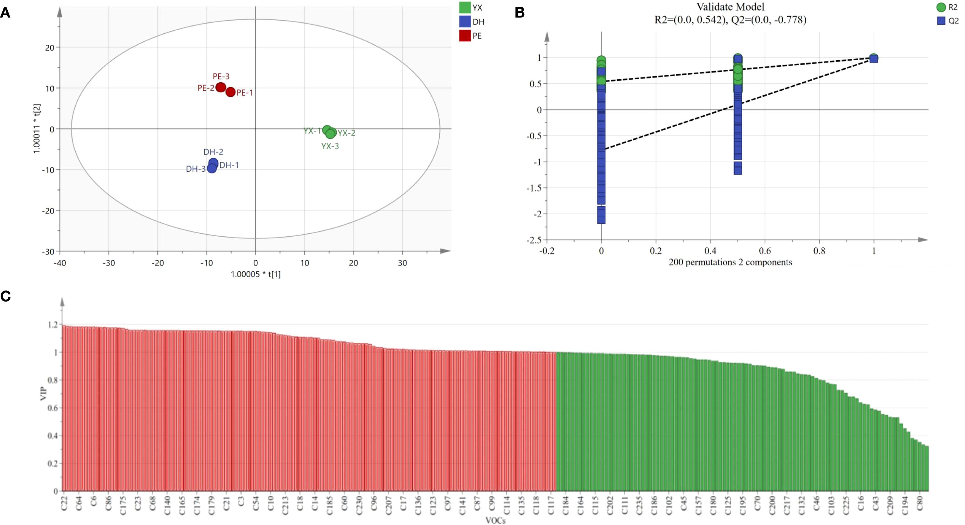 Panel A displays a PCA score plot with three groups: YX in green, DH in blue, and PE in red, showing distinct clustering. Panel B shows a validation model plot with R2 and Q2 values across 200 permutations. Panel C is a bar chart of VIP scores for VOCs, with C21 having the highest score, and red bars transitioning to green.