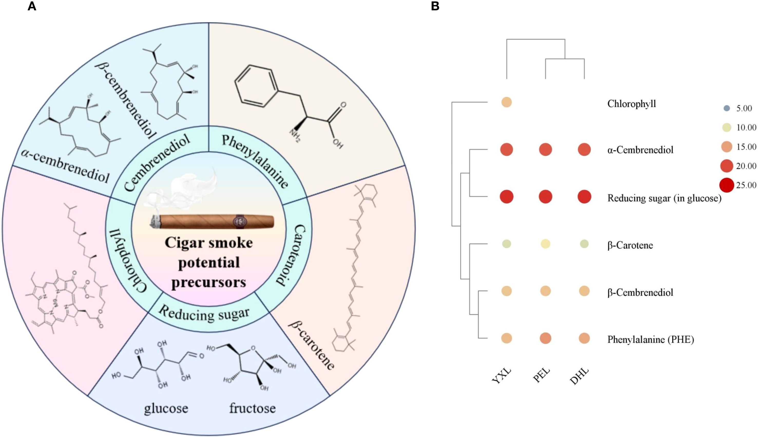 In a nutshell, the flavor compounds in cigars mainly originate from five major groups of potential precursor components: cembrenediol, phenylalanine, chlorophyll, carotenoid and reducing sugar. The exact degradation routes still need to be explored and verified by methods such as modeling experiments and isotope tracer techniques.