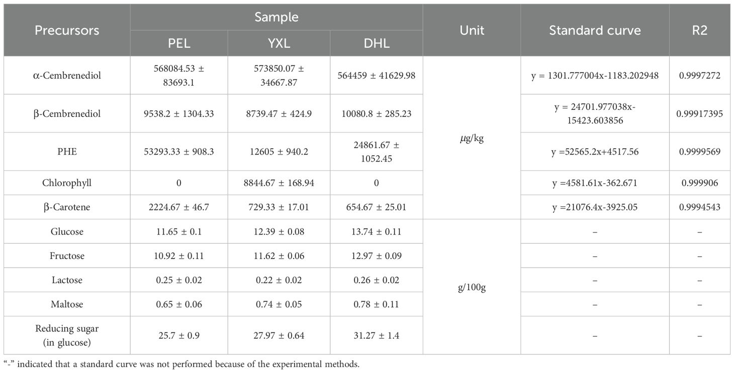 Carotenoids are a group of important natural pigments, including β-carotene, lutein, etc. As well as chlorophyll, carotenoids are a class of pigments found in cigars. At the same time, they are also potential precursors for the formation of volatile flavor compounds. Among the multiple carotenoids, β-carotene might be the main source of volatile flavor compounds in cigar smoke. The highest amount of β-carotene was found in PEL (2224.67 μg/kg), which was approximately more than three times that found in YXL and DHL. In YXL and DHL, the levels of β-carotene were equivalent. The generation of carotenoid degradation products mainly involved multi-stage transformation processes in tobacco processing, including tobacco drying, fermentation, maturation and other process. For the three cigar smoke samples in this study, benzaldehyde and 6-methyl-5-hepten-2-one might originate from the degradation of carotenoids (Zhang et al., 2017). In the process of tobacco fermentation, carotenoids are gradually degraded under the effect of lipoxygenase (LOX), peroxidase (POD) and other enzymes, which can generate farnesyl acetone, megastigmatrienone and so on. After that, it is further degraded into small molecule compounds such as β-ionone and β-damascone (Zhang et al., 2017). However, these compounds were not detected in this study, which may be related to the assay method and the samples themselves. During the conversion of cigar combustion to smoke, the degradation products might be further pyrolyzed to form benzaldehyde and 6-methyl-5-hepten-2-one as detected herein.