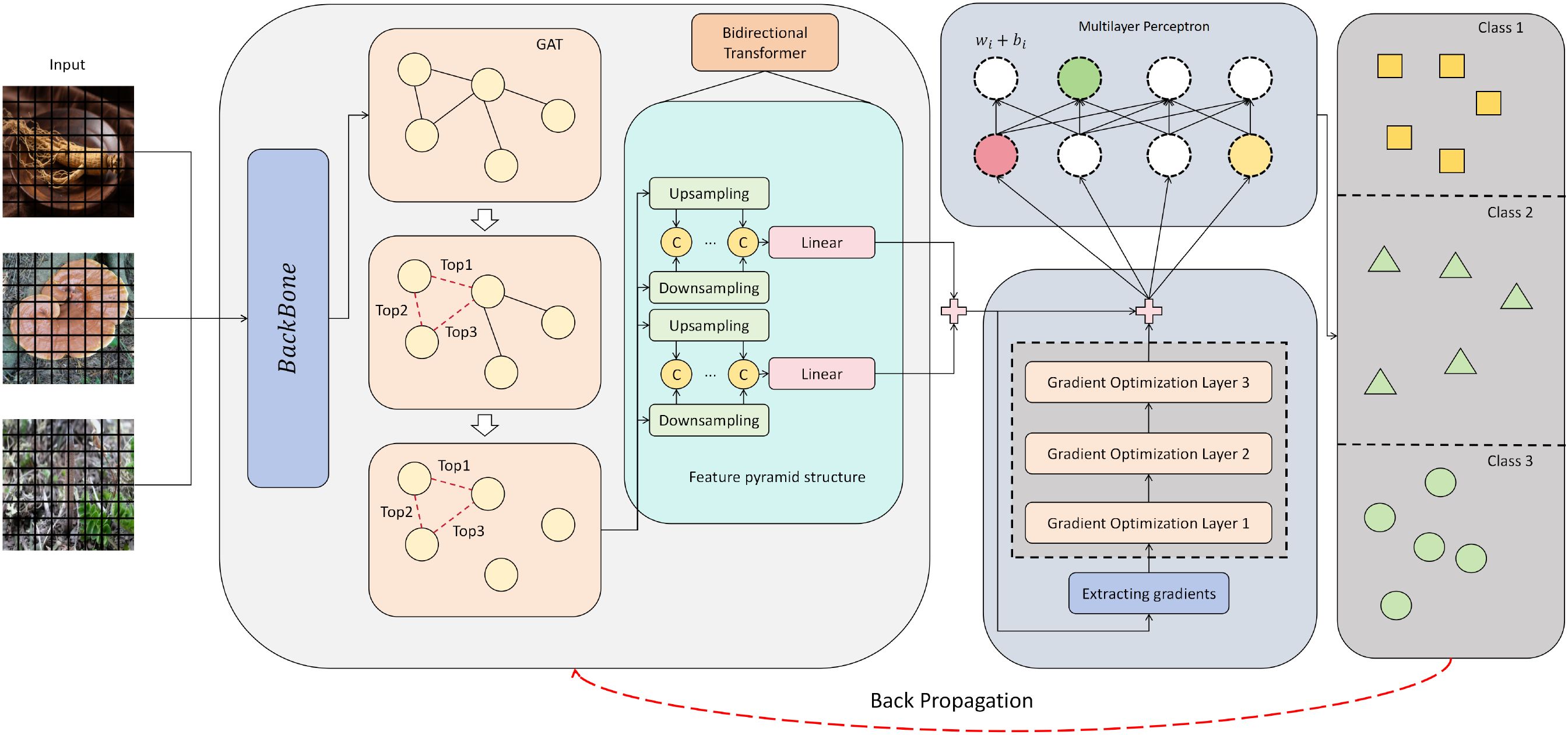 Figure 1. Overall architecture of the proposed herbal image recognition model. The model employs a SwinTransformer backbone augmented with a Graph Attention Network to capture relational dependencies, incorporates a feature pyramid with a bidirectional transformer for multi-scale semantic fusion, and integrates a gradient optimization module for enhanced representation learning.