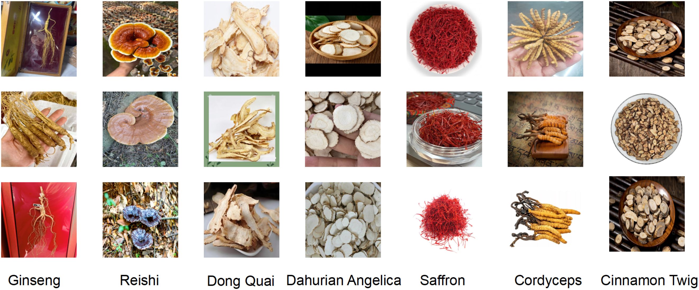 To enhance recognition accuracy for specific herbal categories, we additionally constructed a custom dataset containing 1,872 images across 7 representative classes of commonly used Chinese medicinal herbs, including Panax ginseng (268 images), Ganoderma lucidum (270 images), Angelica dahurica (265 images), Cinnamomi ramulus (267 images), Crocus sativus (269 images), Cordyceps sinensis (266 images), and Angelica sinensis (267 images). All images were standardized to a resolution of 640 × 640 pixels to ensure consistency in training and evaluation. The dataset was constructed through a combination of web scraping from open-access online repositories, retrieval from herbarium databases, and field photography conducted by researchers. Each image was screened and validated independently by two experts in traditional Chinese medicine, and disagreements were resolved through discussion to ensure annotation consistency. The images reflect real-world conditions under varying angles, lighting, and background settings. Designed as a structurally simple and semantically clear medium-scale benchmark, this dataset complements large-scale public datasets by addressing the limited coverage of certain herbal categories and evaluating the model’s generalization and adaptability in fine-grained recognition tasks. An example of this dataset is shown in Figure 5.