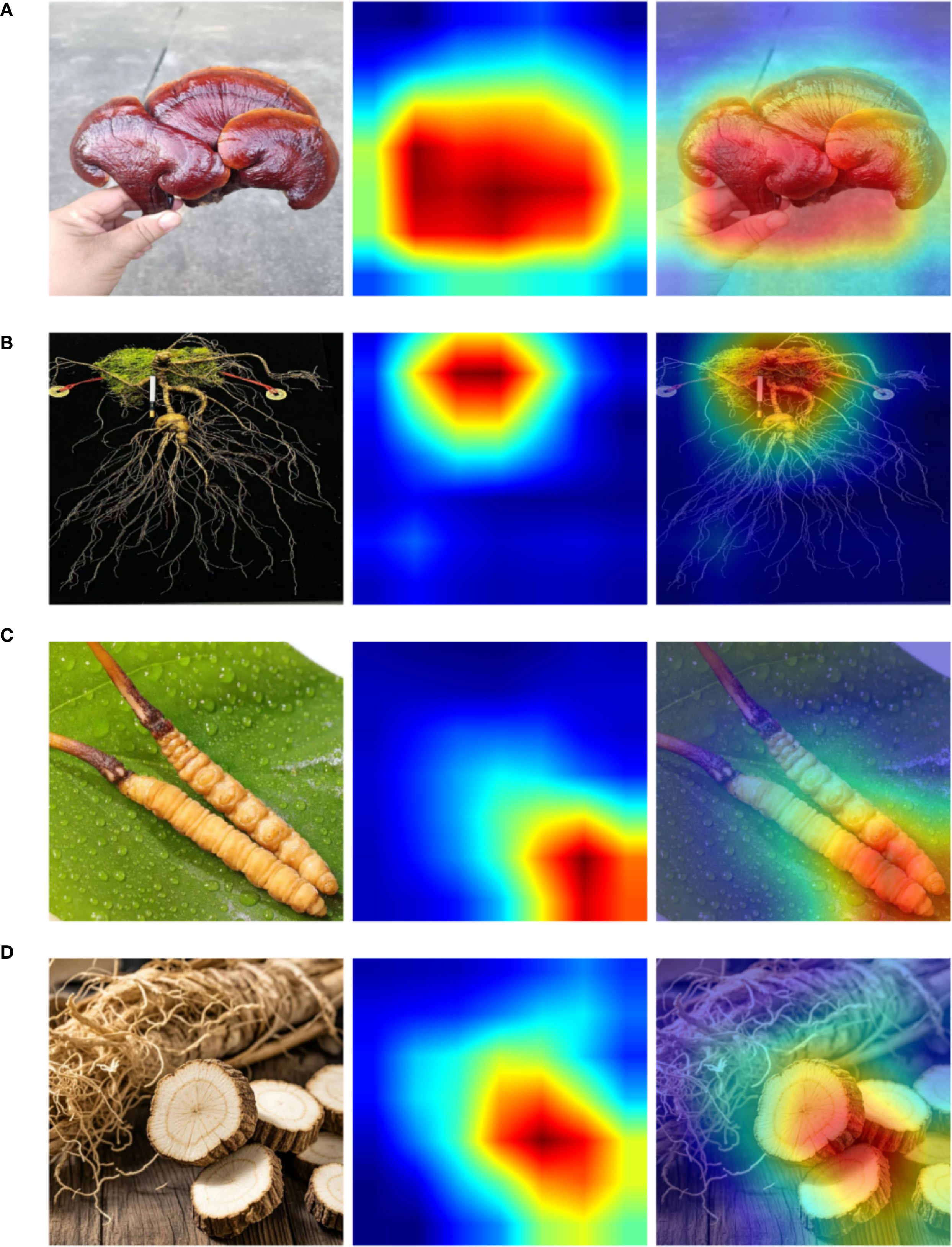 From the visualization results, it is evident that the model is capable of accurately focusing on key structural regions within herbal images during the recognition process. For instance, in the sample of Ganoderma lucidum shown in Figure 7A, the high-response regions highlighted by Grad-CAM closely align with the main contour of the mushroom cap, indicating that the model effectively captures representative local texture features during classification. Similarly, in the example of Cordyceps sinensis in Figure 7C, the attention is concentrated around the junction between the insect body and the fungal stem—an area that also holds strong discriminative significance in manual identification—further confirming the rationality and consistency of the model’s decision-making basis.
