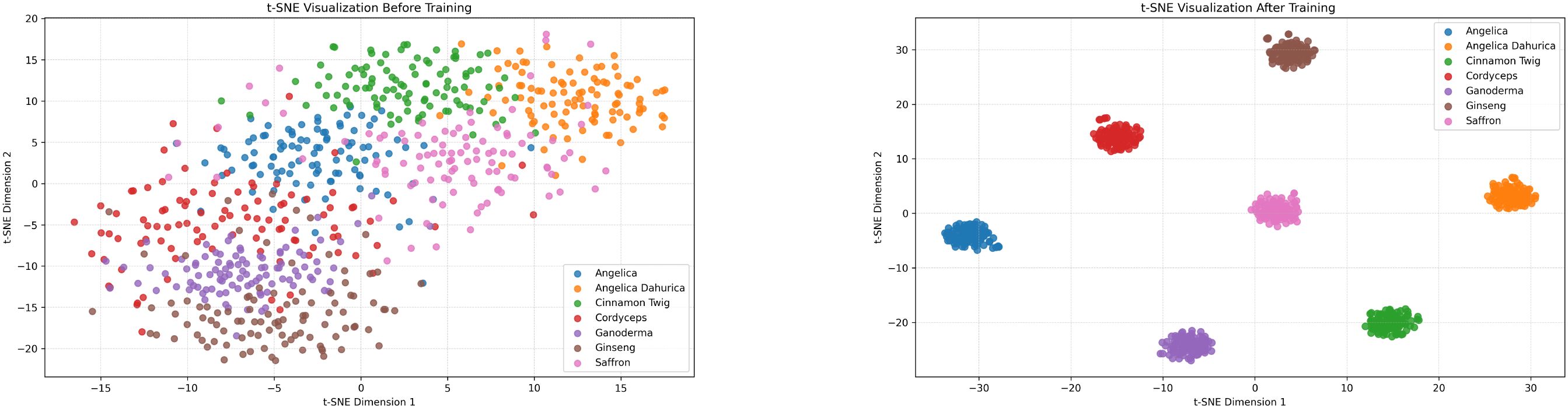 Figure 8. t-SNE visualizations of feature distributions before (left) and after (right) training on the custom herbal dataset.
