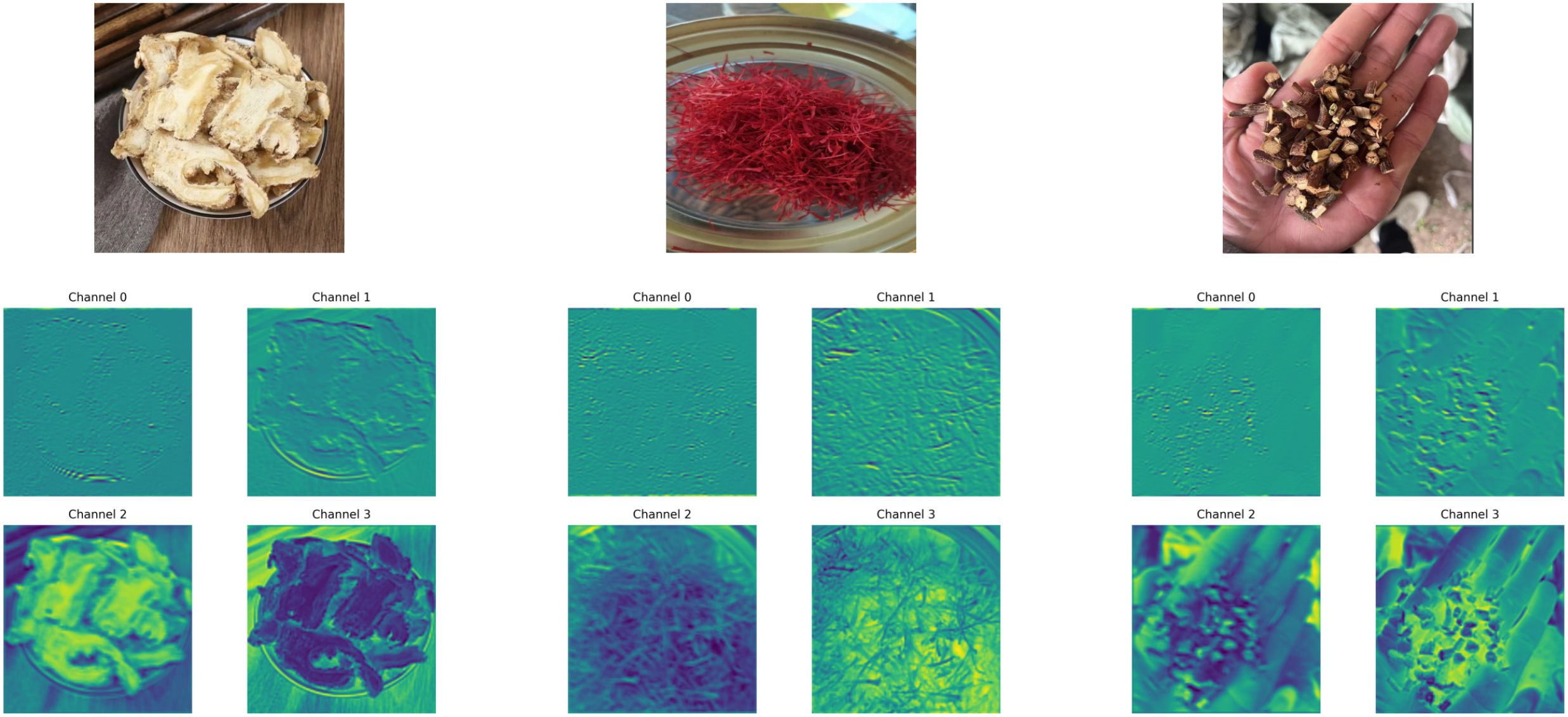 As observed from the visualization, the model’s shallow-layer channels primarily focus on texture edges and local structural details of the input images. These low-level semantic features are consistently highlighted across various herbal categories, often manifesting as strong activations along contour lines, texture flows, and other fundamental visual elements. As the network depth increases, the mid- to high-level channels progressively attend to semantically meaningful regions, such as the morphological contours, tissue structures, and even central discriminative parts of the herbs. This indicates that the model successfully performs hierarchical abstraction from low-level perception to high-level semantic representation.