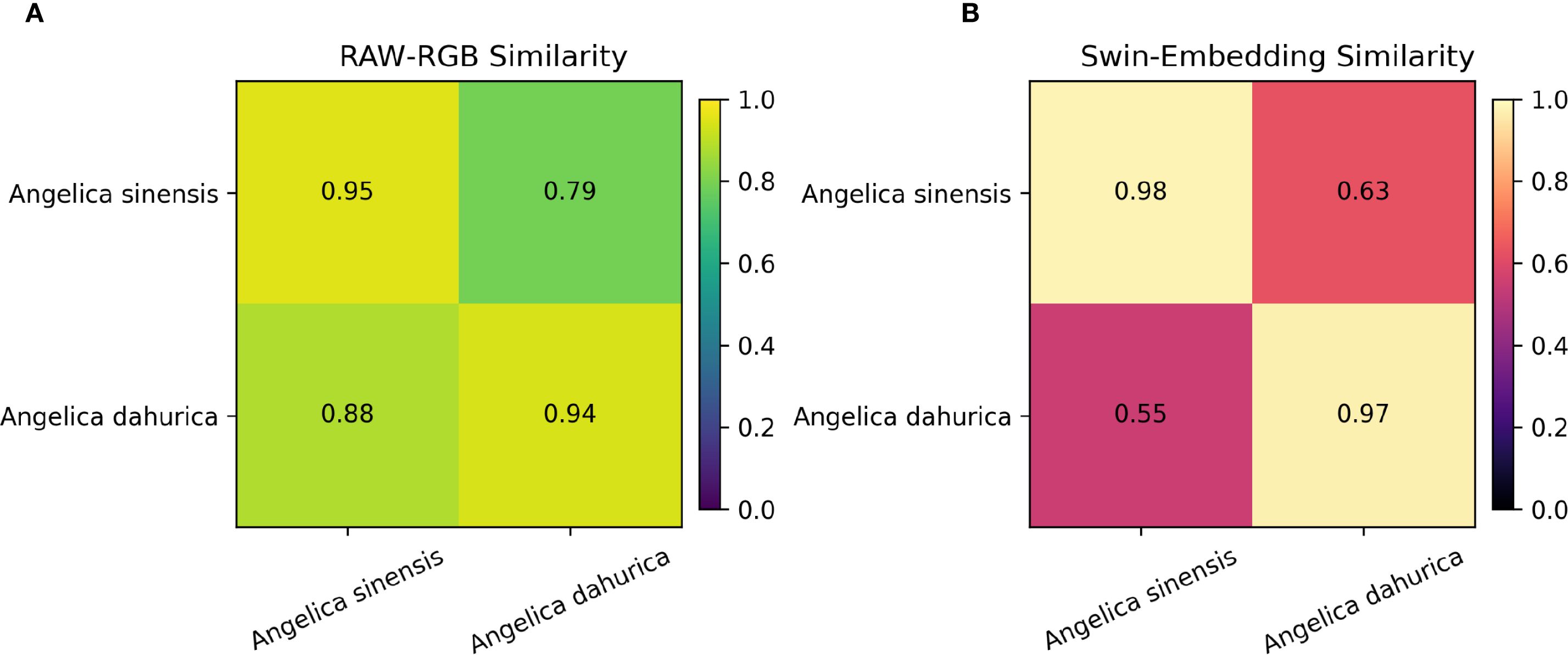 Figure 11. Comparison of cosine similarities between Angelica sinensis and Angelica dahurica in (A) raw RGB space and (B) Swin Transformer embedding space, demonstrating improved class separability with deep features.