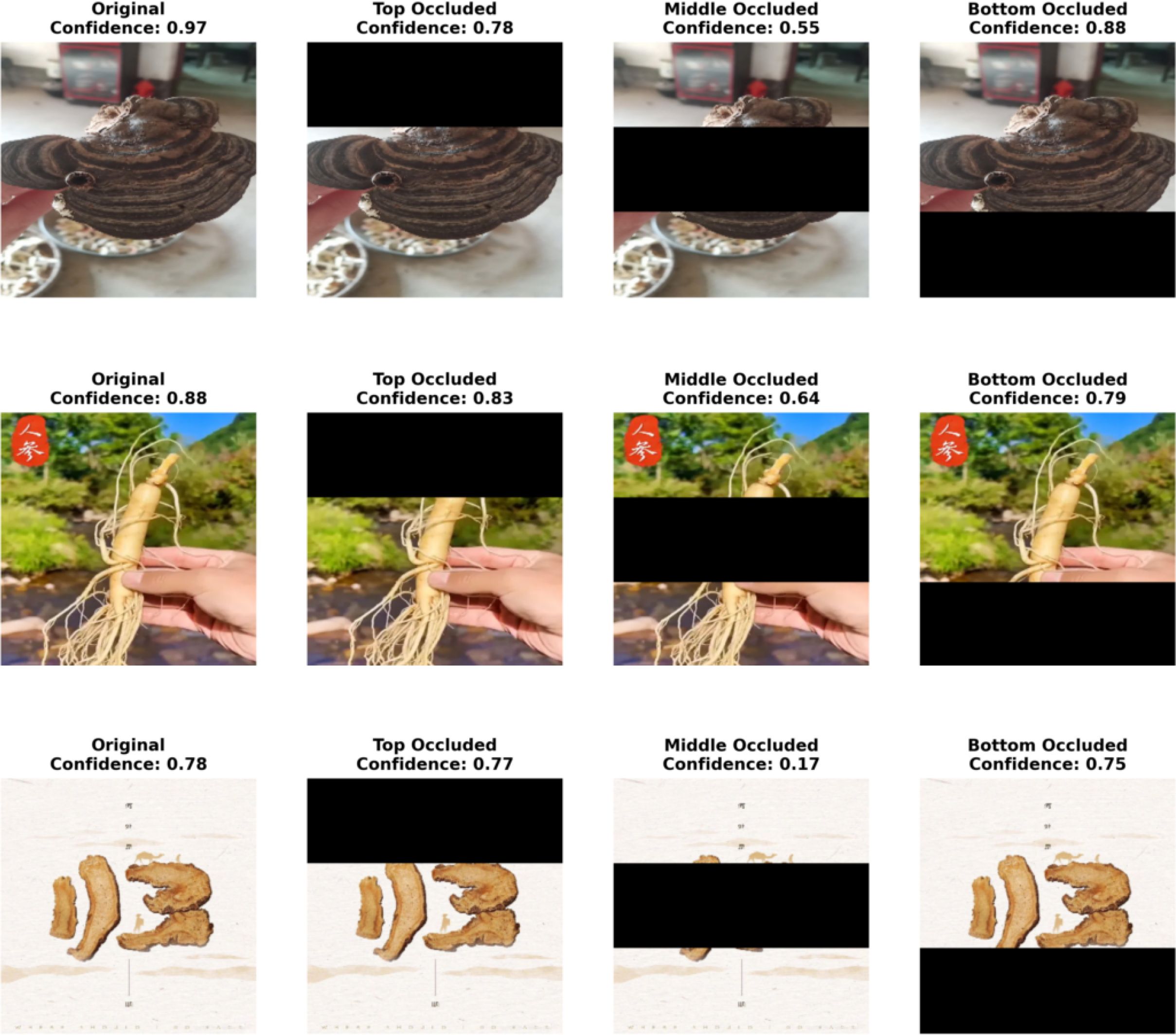 As shown in Figure 12, occlusions at different spatial locations have markedly distinct impacts on the model’s prediction confidence, highlighting its sensitivity to the structural regions of herbal images. Taking Ganoderma lucidum as an example, occlusion in the middle region causes a sharp drop in confidence from 0.97 to 0.55, indicating that the model heavily relies on the transitional area between the cap and the base during recognition. In contrast, occlusion at the bottom has minimal effect, suggesting that the root region contributes little to classification. Similarly, Panax ginseng also exhibits a notable confidence drop when the middle region is occluded, reflecting the model’s sensitivity to the junction between the main root and fibrous roots.