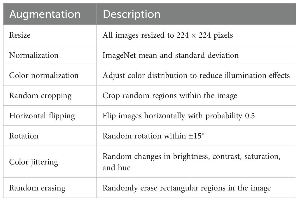 In our image classification experiments, we adopt the Swin-Transformer Base as the visual backbone, with model parameters initialized from publicly available ImageNet-pretrained weights to enhance feature generalization and accelerate convergence. Prior to training, all herbal images are resized to 224 × 224 pixels, normalized using the ImageNet mean and standard deviation, and color normalization to reduce the influence of illumination variations. To further improve model robustness, we apply a series of augmentation strategies, including random cropping, horizontal flipping, rotation within ±15°, color jittering, and random erasing, which simulate real-world variability in imaging conditions and morphological perspectives. The data augmentation table is shown in Table 1.