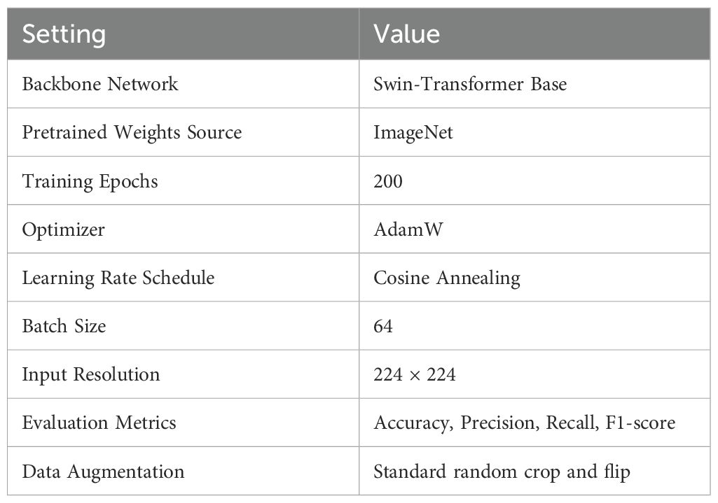 All models are trained and evaluated on both the TCMP-300 dataset and the self-constructed herbal dataset. The training process spans 200 epochs, utilizing the AdamW optimizer with a cosine annealing learning rate schedule. A grid search strategy is employed to tune key hyperparameters such as learning rate, weight decay, and batch size, ensuring fair and optimized comparisons across different baselines. During both training and evaluation, we employ four standard metrics—Accuracy, Precision, Recall, and F1-score—to comprehensively assess the model’s performance on fine-grained herbal recognition tasks. The detailed experimental settings are summarized in Table 2.