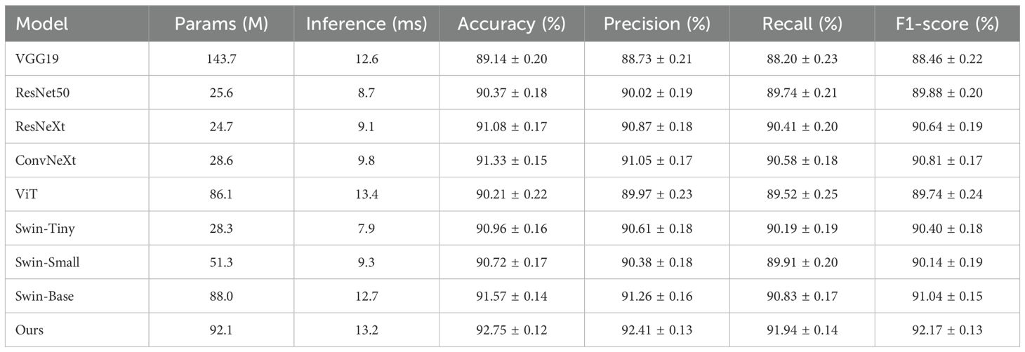 Table 4. Comparison of classification performance across different models on the self-built herbal dataset with computational efficiency (mean ± std over three independent runs).