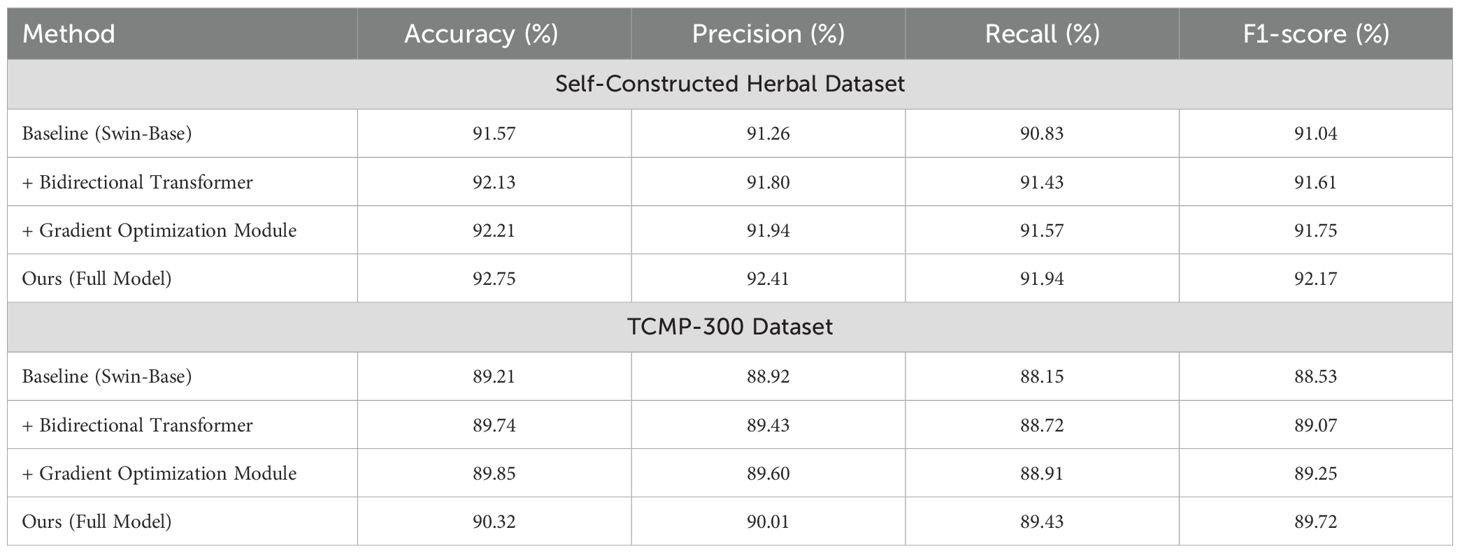 To further validate the effectiveness of the Bidirectional Transformer and Gradient Optimization Module in enhancing model performance, we conduct a series of ablation experiments on both the TCMP-300 dataset and the self-constructed Chinese herbal image dataset. All experiments are based on the Swin Transformer Base architecture, and we systematically remove each of the proposed modules to perform controlled comparisons. The complete ablation results are summarized in Table 5.