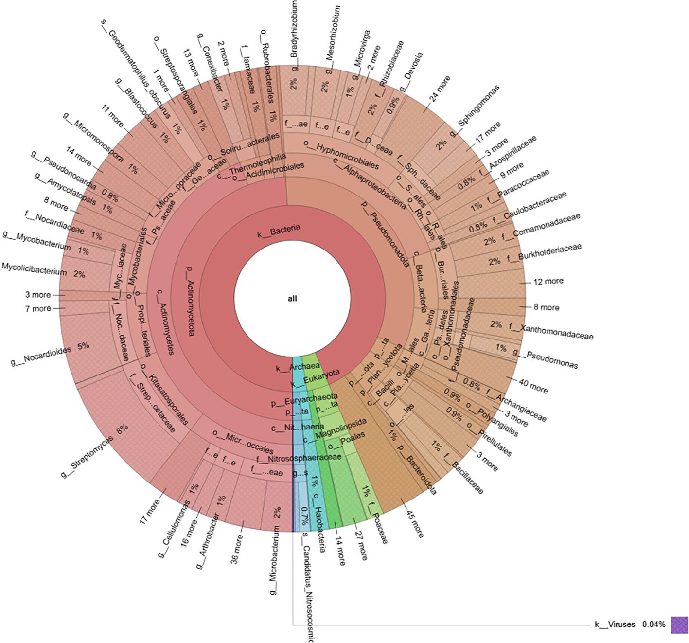 Figure 1. Circular phylogenetic tree illustrating the diversity and abundance of microbial taxa of the soil where C. maritima plants were collected.