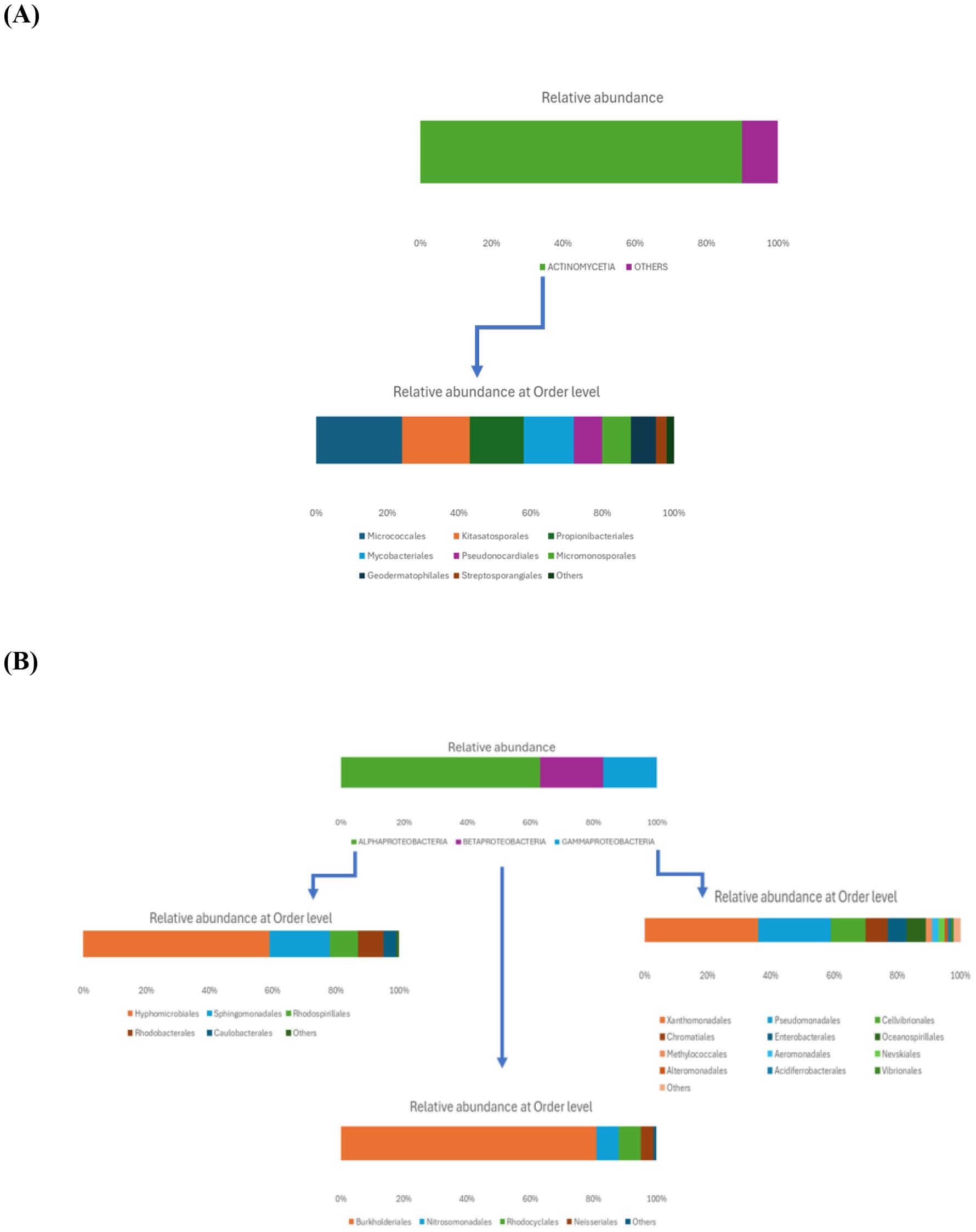 Figure 2. Relative abundance of rhizosphere soil bacterial communities at the class and order level within the Actinomycetota (A) and Pseudomonadota (B) phyla.