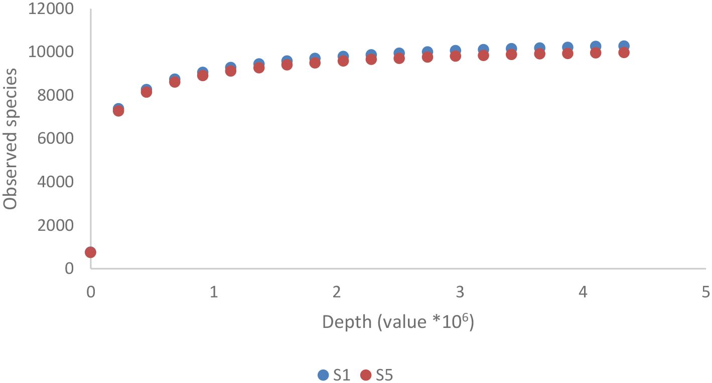 Figure 3. Rarefaction curve for the metagenomic analyses of the two soil samples. The sites (S1: N 41.431624, E 16.008846; S5: N 41.427654, E 16.007945) were both located in Margherita di Savoia coastal dunes (Barletta-Andria-Trani area in the northeastern Apulia, Italy).