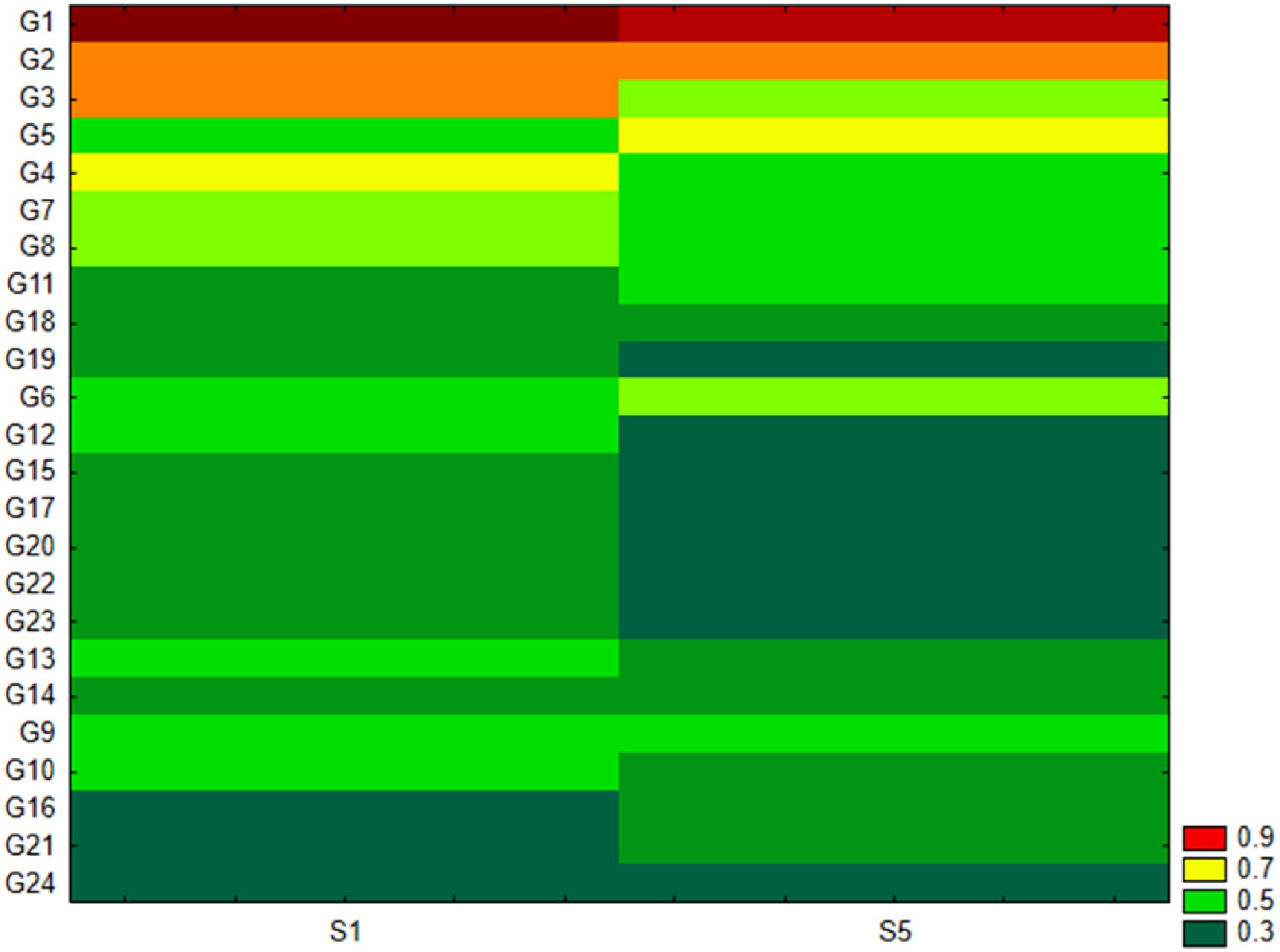Figure 4. Heat map analysis for the top genera in the two soil samples. G1, Geodermatophilus obscurus; G2, Candidatus Nitrosocosmicus oleophilus; G3, Blastococcus sp. PRF04-17; G4, Catellatospora sp. IY07-71; G5, Arthrobacter crystallopoietes; G6, Sorangium cellulosum; G7, Blastococcus saxobsidens; G8, Conexibacter woesei; G9, Capillimicrobium parvum; G10, Conexibacter sp. SYSU D00693; G11, Gemmatirosa kalamazoonensis; G12, Cellvibrio sp. PSBB006; G13, Modestobacter marinus; G14, Archangium gephyra; G15, Cellulosimicrobium cellulans; G16, Candidatus Nitrosocosmicus hydrocola; G17, Kocuria rosea; G18, Rubrobacter tropicus; G19, Baekduia alba; G20, Microvirga sp. VF16; G21, Nannocystis poenicansa; G22, Microvirga ossetica; G23, Iamia sp. SCSIO 61187; G24, Sandaracinus amylolyticus.