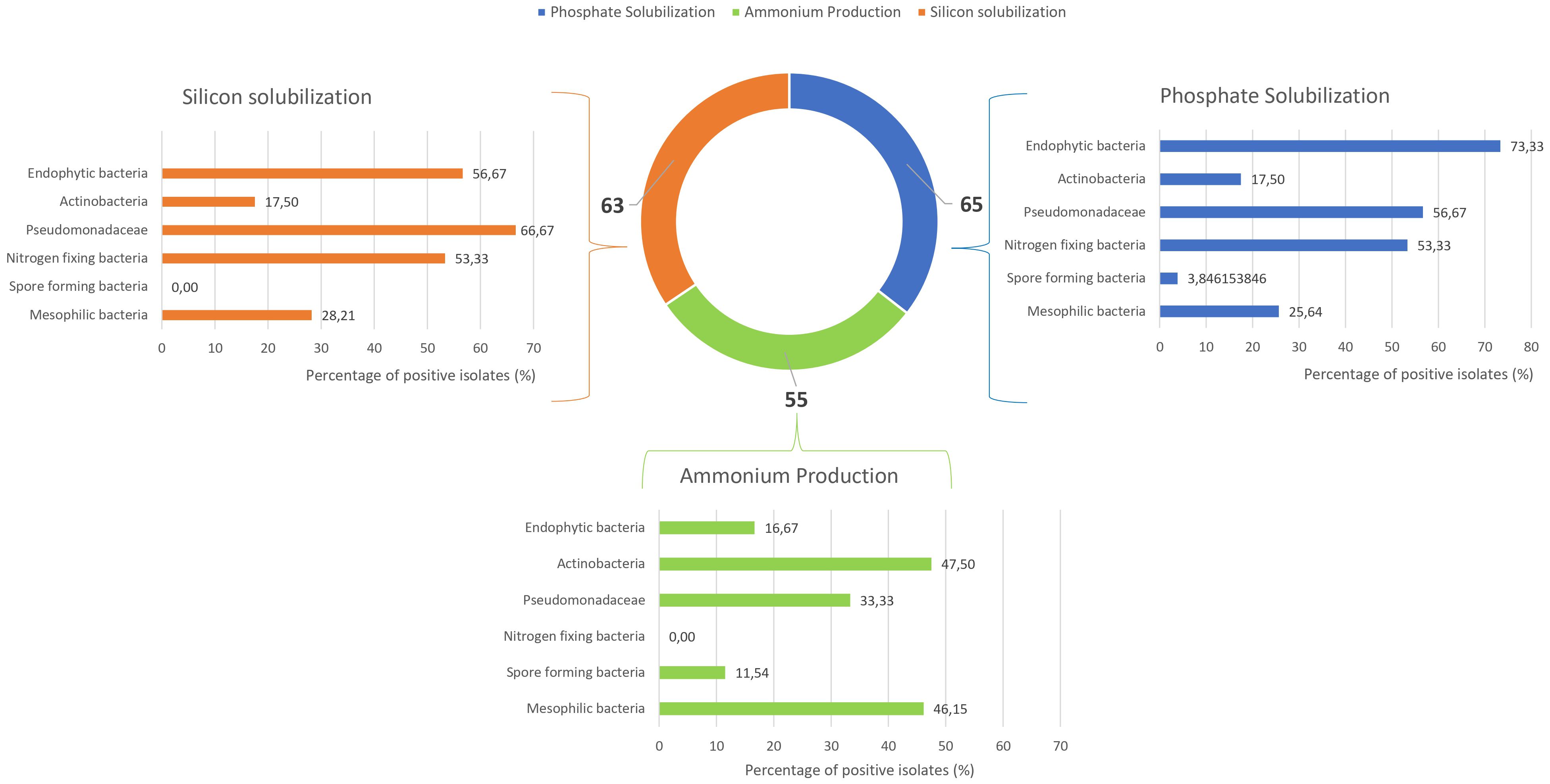 Figure 5. Bar and donut charts showing the percentage of positive strains for silicon solubilization, phosphate solubilization, and ammonium production.