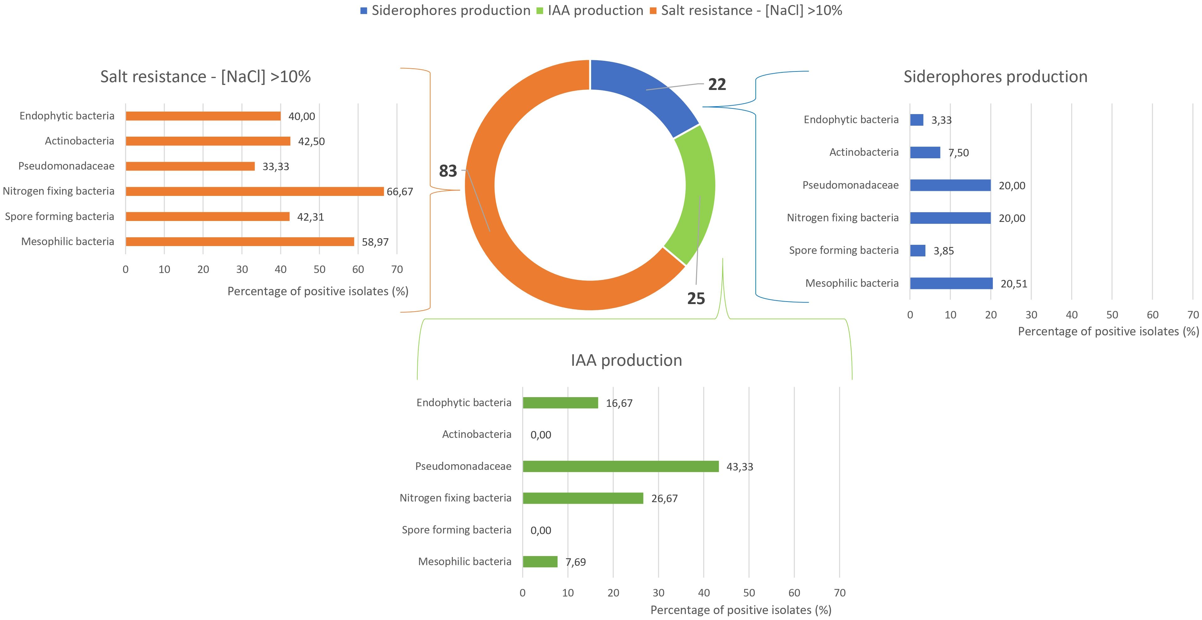 Figure 6. Strains resistant to NaCl >10% and positive for siderophores’ production, and Indole-3-Acetic Acid (IAA) production.