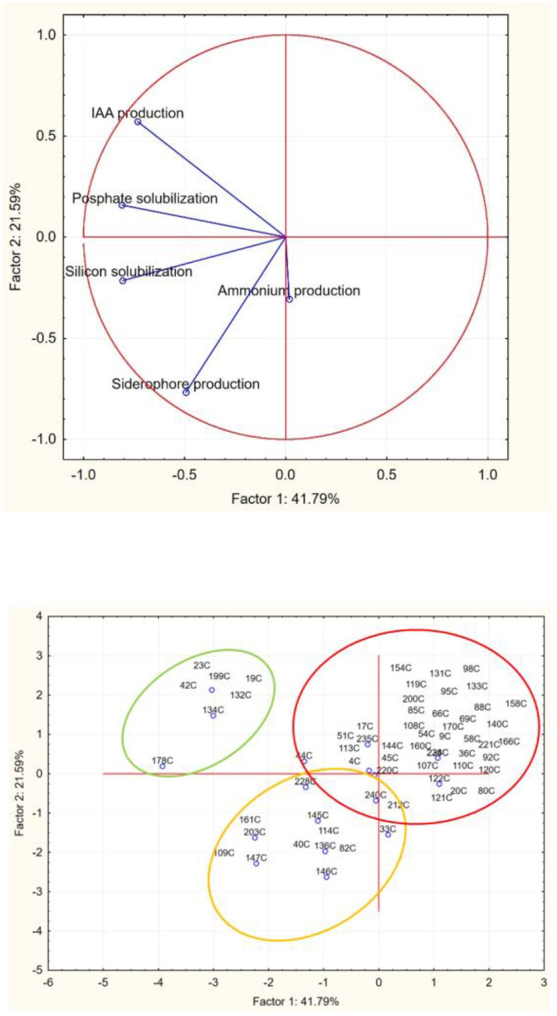 The analyses were carried out in two independent batches. For each experiment, two technical replications were performed. The results of the qualitative analyses (ammonium production, phosphate solubilization, silicon solubilization, IAA production, siderophores) were converted into numeric codes (0, negative in all replicates of each isolate; 1, positive in all the replicates) and used as input values to run a principal component analysis; the Euclidean distance was used as the amalgamation method. This statistical analysis was performed using Statistica for Windows (StatSoft, Tulsa, OK, USA).