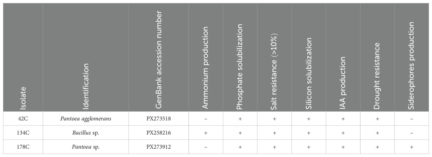 The high taxonomic diversity within dominant phyla, together with metabolically specialized orders, reflects a well-structured soil microbial community potentially rich in PGPB traits. This justified the isolation and characterization of bacterial strains. Among the 180 isolates, the predominance of Gram-positive spore-forming bacteria and Gram-negative Pseudomonadaceae agrees with previous findings in saline environments, where these bacterial groups are known to thrive due to their robust stress tolerance mechanisms (Etesami and Beattie, 2018). The result found for phosphate solubilization (65 out of 180) is particularly significant, as phosphorus availability is often limited in saline soils due to precipitation with calcium and magnesium ions. Notably, endophytic bacteria capable of solubilizing this compound suggest that these internal plant-associated microorganisms may play a crucial role in phosphorus nutrition under saline conditions. This result agrees with recent studies highlighting interesting PGPB activities of endophytes compared to rhizosphere bacteria (Santoyo et al., 2021). The strong efficiency of presumptive Pseudomonadaceae (57% positive) in phosphate solubilization is already well-documented in various environments (Santoyo et al., 2021). This trait, combined with their salt tolerance, makes them particularly valuable for agricultural applications in saline soils.