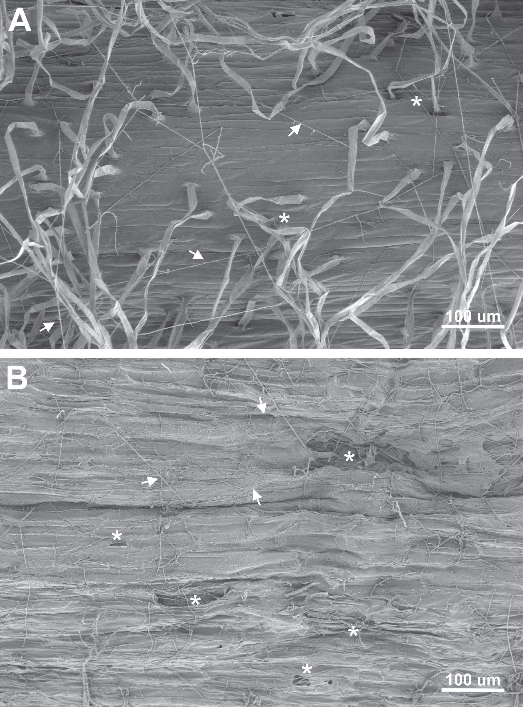 Figure 1. Appearance of the maize primary root epidermis seven days after seed infection by Fusarium verticillioides DA42 strain. Two regions with contrasting appearances were analyzed by SEM, (A) a region without visible necrosis, and (B) a necrotic region. Root hairs with collapsed bases or holes are marked with asterisks (*), and fungal growth on the epidermis surface is indicated by arrowheads.