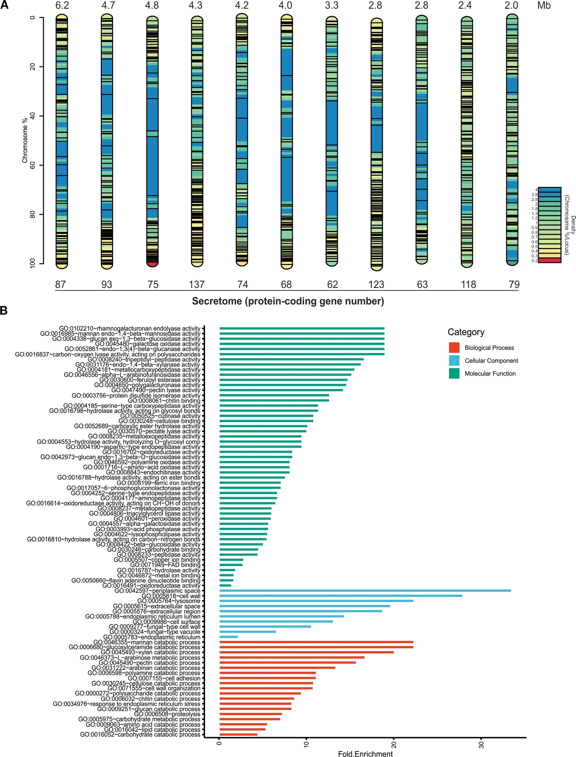 Panel A shows a comparative chromosomal map with secretome gene numbers indicated along the chromosomes. The heatmap on the right represents fold enrichment values. Panel B displays a bar chart of fold enrichment categorized into biological processes, cellular components, and molecular functions, with green bars for molecular functions, blue for cellular components, and red for biological processes. The chart includes gene ontologies related to enzyme activities and metabolic processes.