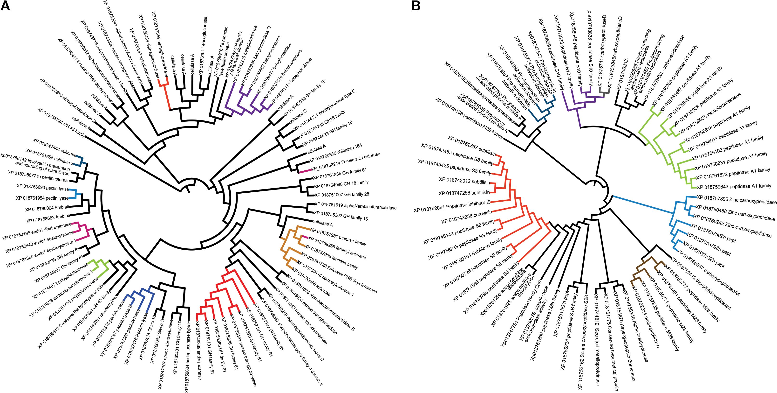 Figure 4. Phylogenetic analysis using the UPGMA method to cluster proteins by their evolutionary similarity of two secreted protein groups of Fusarium verticillioides DA42 strain. (A) CAZymes and (B) proteases. Proteins with close sequences are clustered and shown in the same color.