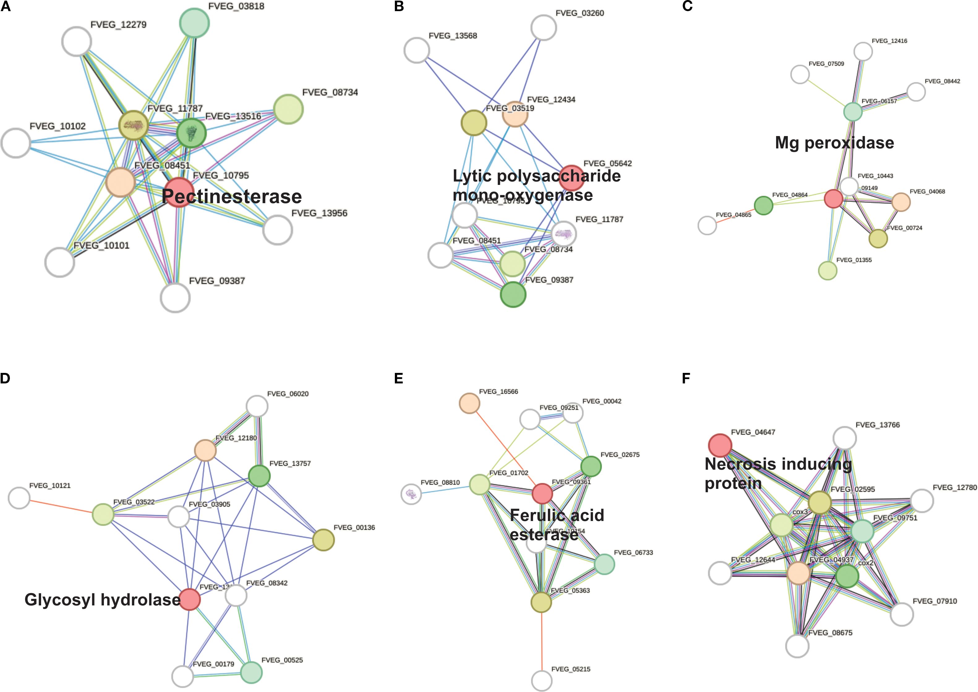 Figure 5. Protein-protein interactions in the effector proteins identified by their high identity (>80%) with the PHI-base database. Confidence scores were extracted from STRINGdb. (A) Pectinesterase (FVEG_10795), (B) Lytic polysaccharide mono-oxygenase (FVEG_05642), (C) Mg peroxidase (FVEG_09149), (D) Glycosyl hydrolase (FVEG_13183), (E) Feruloyl esterase (FVEG_09361), and (F) Necrosis inducing protein (FVEG_04647).
