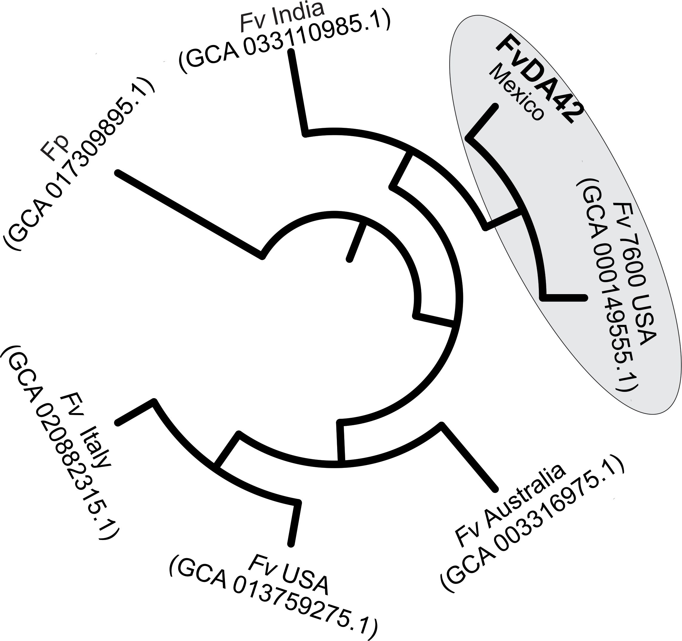 The phylogenetic analysis of the genomes included strains isolated from the United States, Australia, India, and Mexico. The phylogenetic tree (Figure 6) showed that the Fv DA42 strain genome from Mexico clustered with the Fv 7600 reference genome (GCA000149555.1) isolate in USA and an Indian strain (GCA033110985.1), however, Fv DA42 strain genome was more closely related to the reference strain than to the Indian strain. In a different tree branch another Fv isolate from USA (GCA013759275.1) groups with the isolate from Italy (GCA020882315.1) and both are more distant to the isolate from Australia (GCA003316975.1). The phylogenetic analysis supports a close evolutionary relationship between the DA42 strain and the reference genome 7600 strain, while revealing partial genetic distances among isolates from different geographic regions of origin.