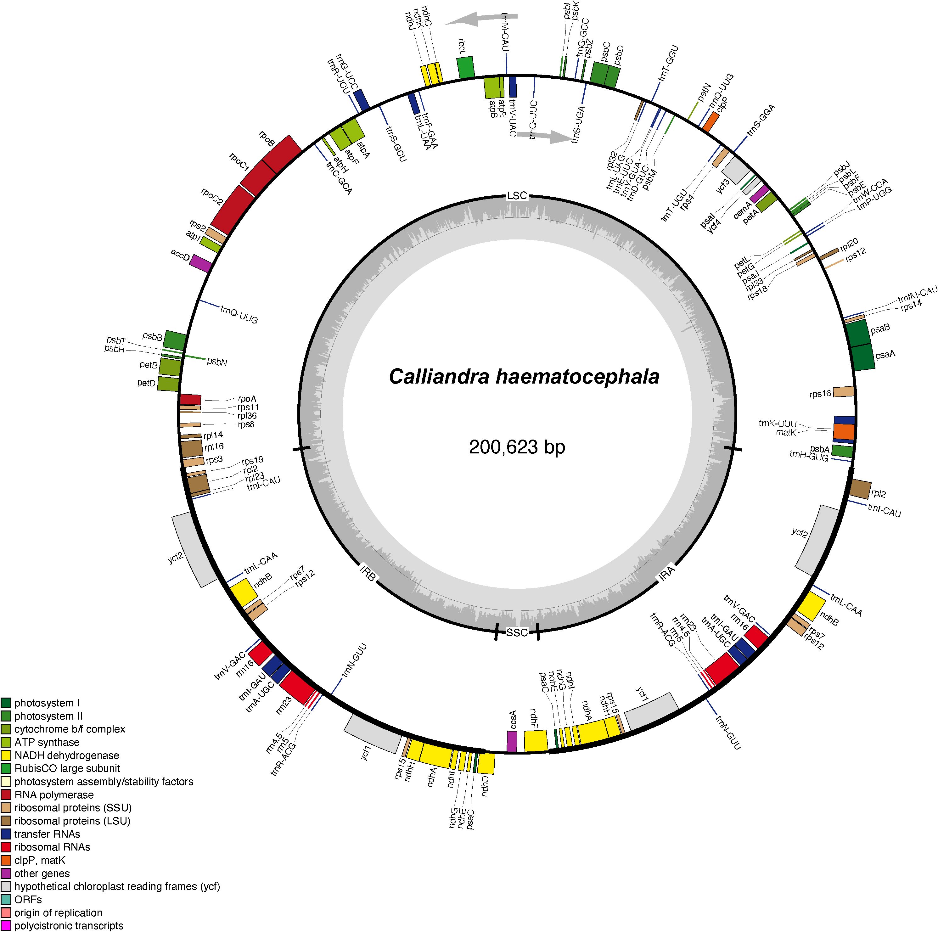 Figure 1. The circular plastome map of Calliandra haematocephala. Genes inside the circle are transcribed clockwise, while genes outside the circle are transcribed counterclockwise. Genes belonging to different functional groups are marked with different colors. The darker and lighter gray areas in the inner circle corresponds to the GC content and AT content, respectively.