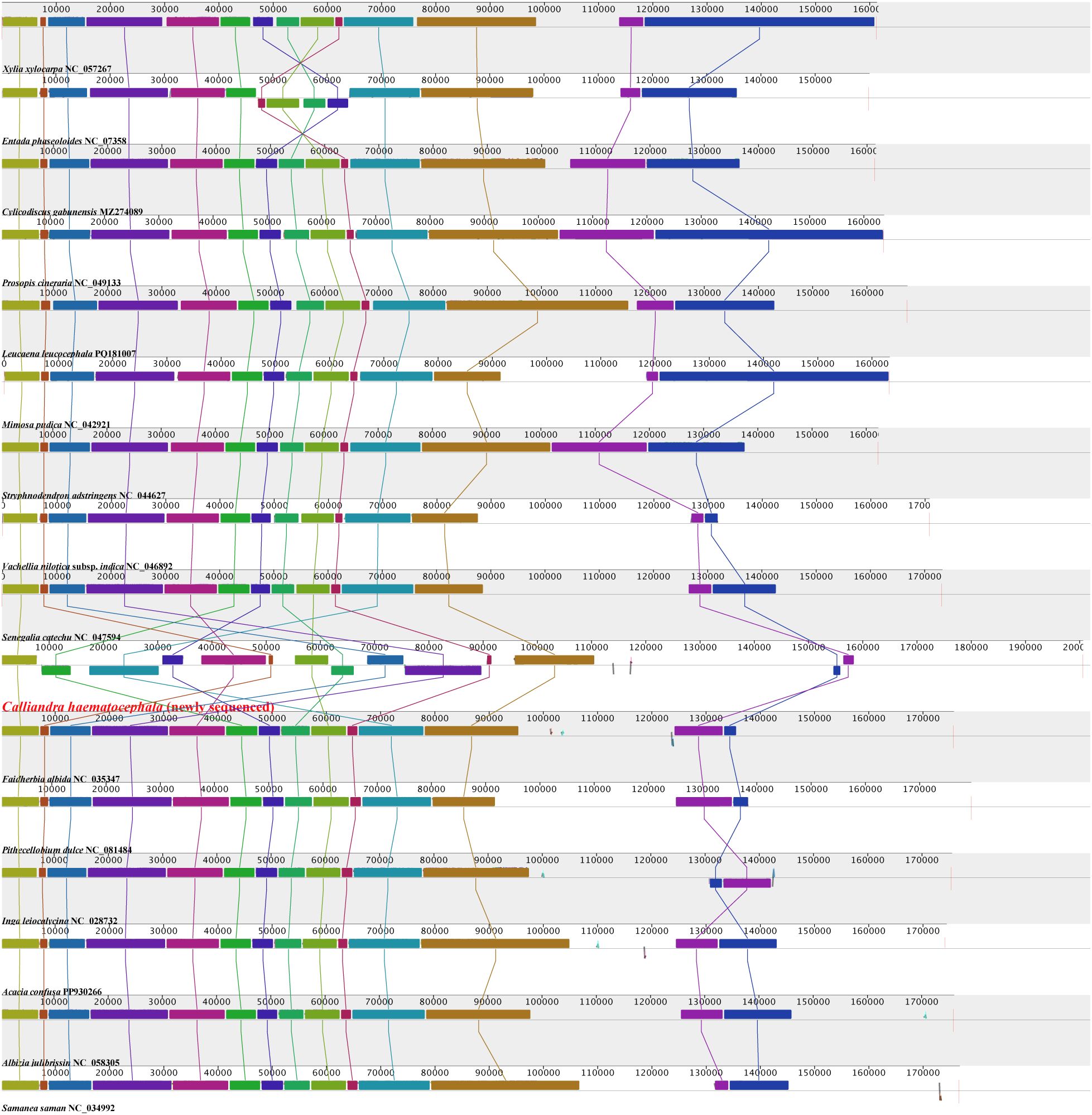 Figure 2. Collinearity comparison analysis of 16 plastomes from tribe Mimoseae. The horizontally arranged colored rectangles linked by sane colored line represent locally collinear blocks, indicating homologous regions with conserved gene order and sequence similarity.