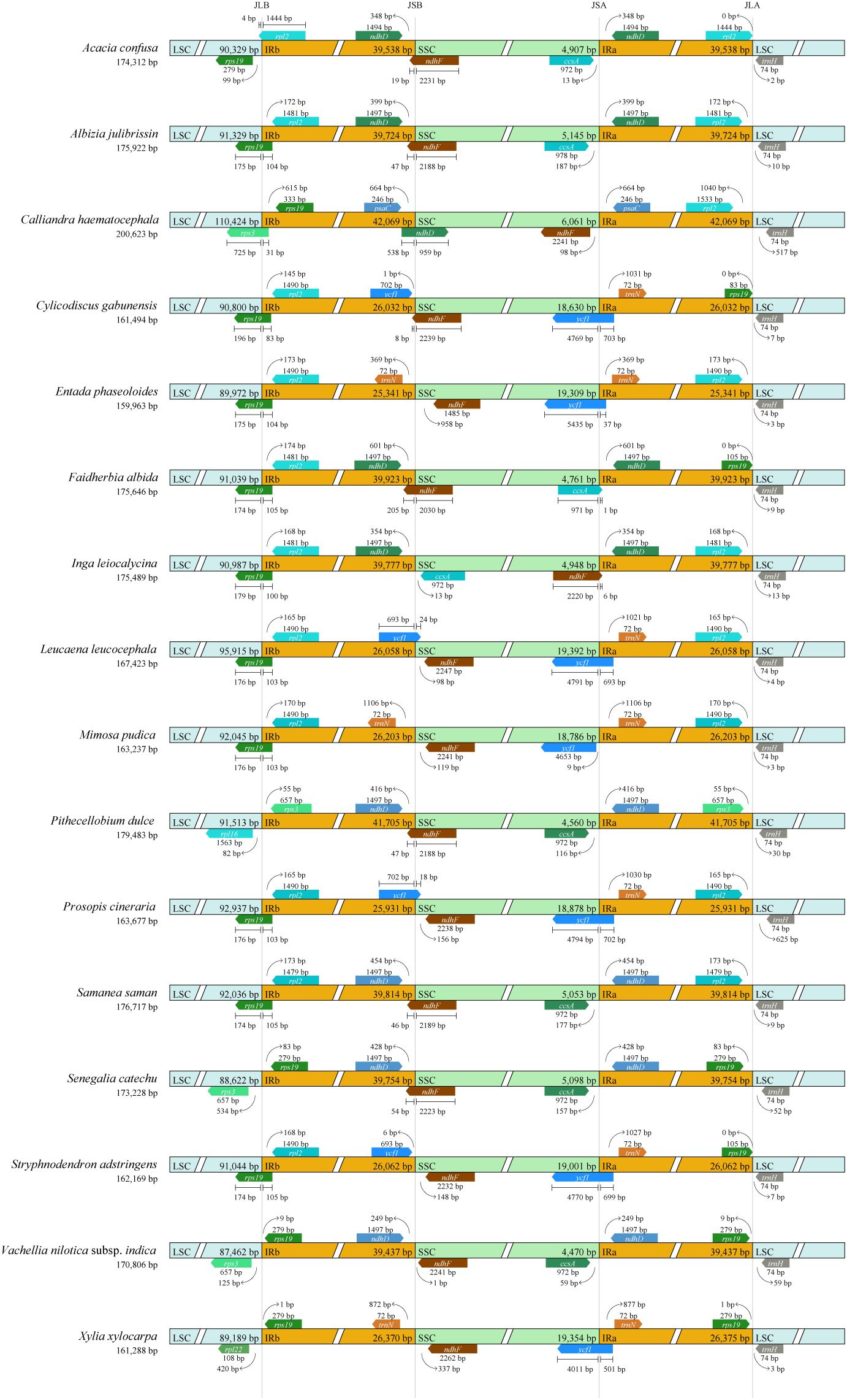 Figure 3. Comparison of the LSC, SSC, and IR boundaries of 16 plastomes from the tribe Mimoseae. JLB, JSB, JSA, and JLA refer to the junctions of LSC/IRB, SSC/IRB, SSC/IRA, and LSC/IRA, respectively. The boxes above and below the line refer to the forward and reverse genes.