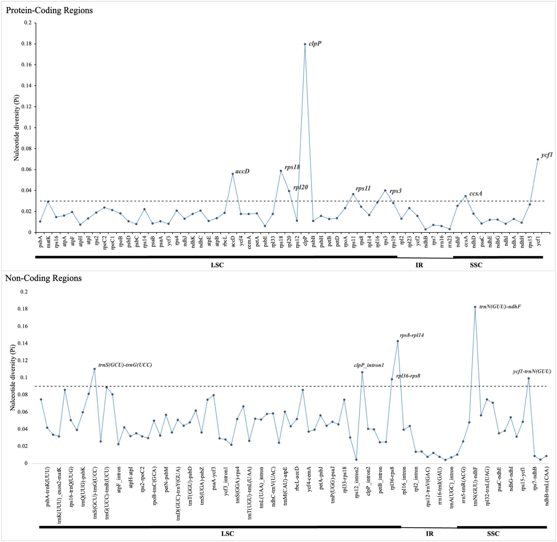 Figure 4. Nucleotide diversity (Pi) values of different regions of 16 plastomes from tribe Mimoseae. The dotted line indicates the threshold for high Pi values.