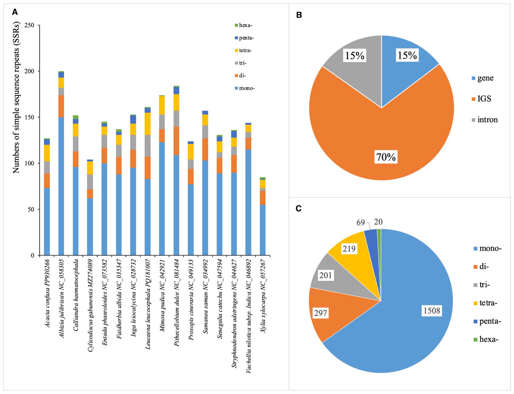 Figure 5. Distribution of simple sequence repeats (SSRs) in 16 plastomes of tribe Mimoseae. (A) Total numbers of SSRs detected in each species; (B) Distribution of SSRs in introns, coding sequences, and intergenic spacers (IGS); (C) Frequency of different SSR types.