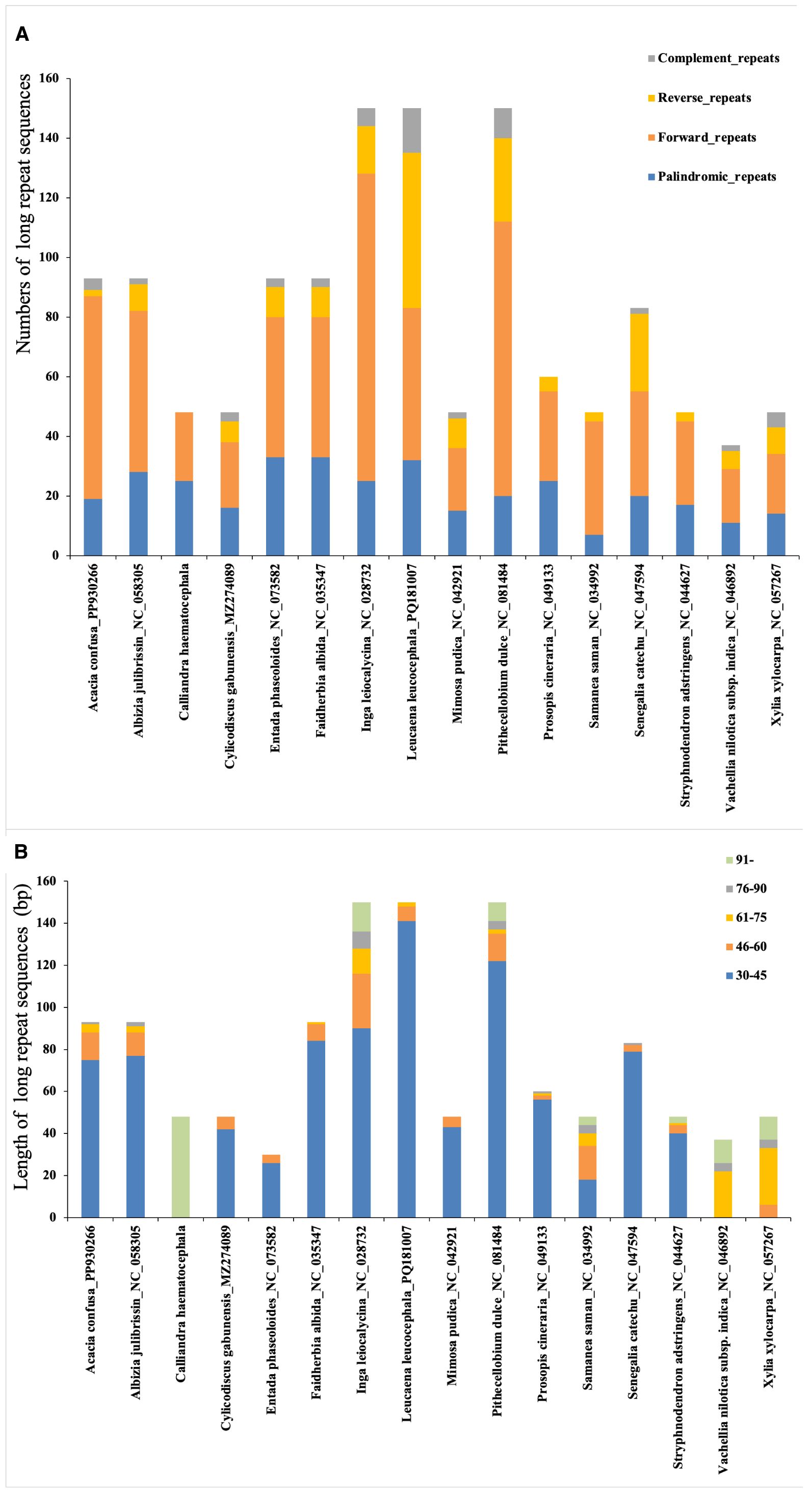 Figure 6. Analysis of long repeat sequences in 16 plastomes of tribe Mimoseae. (A) The types and abundance of long repeat sequences identified in each species; (B) Length distribution of these repeat sequences.