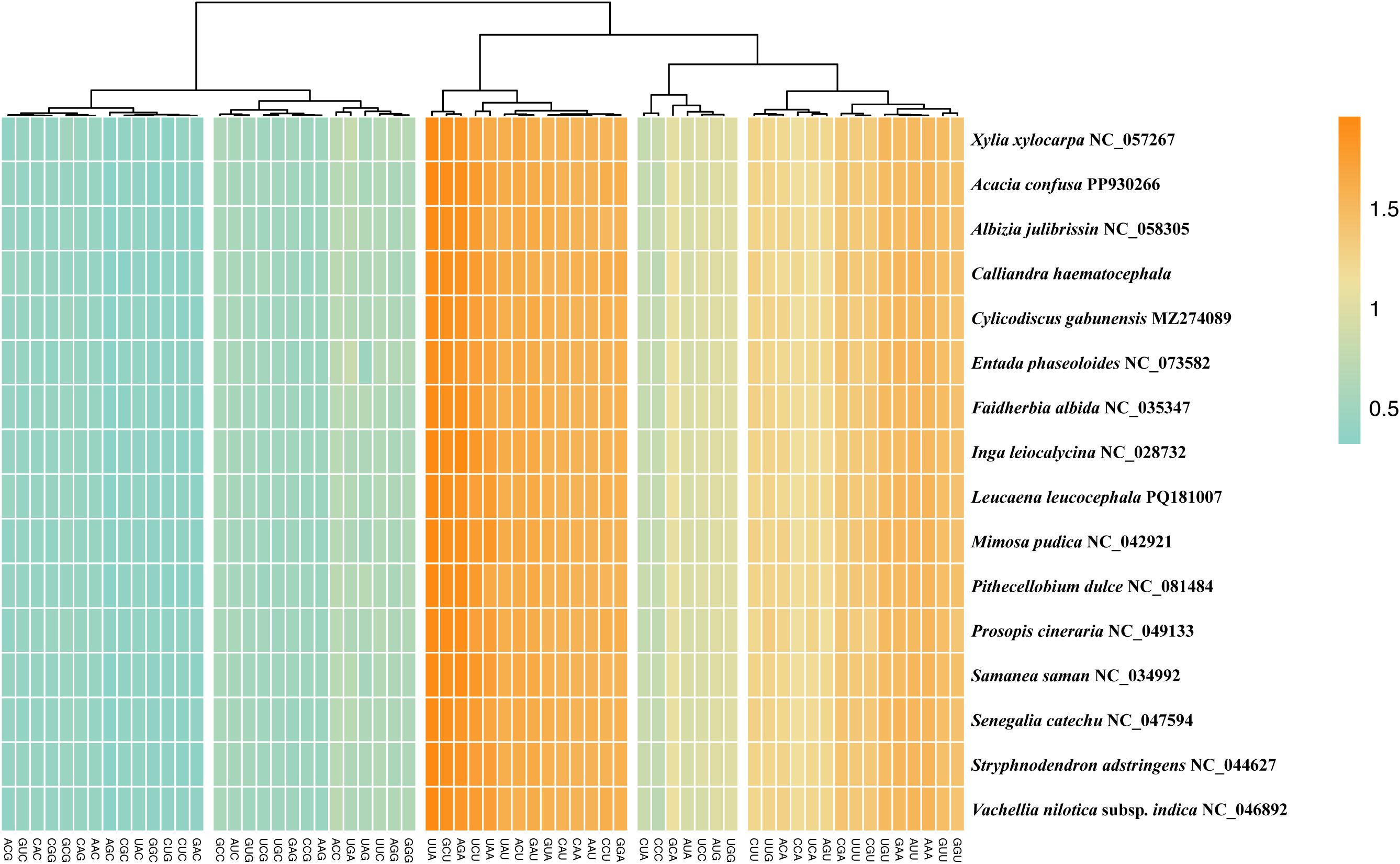 Figure 7. Relative synonymous codon usage (RSCU) analysis for protein-coding genes across 16 plastomes of the tribe Mimoseae.