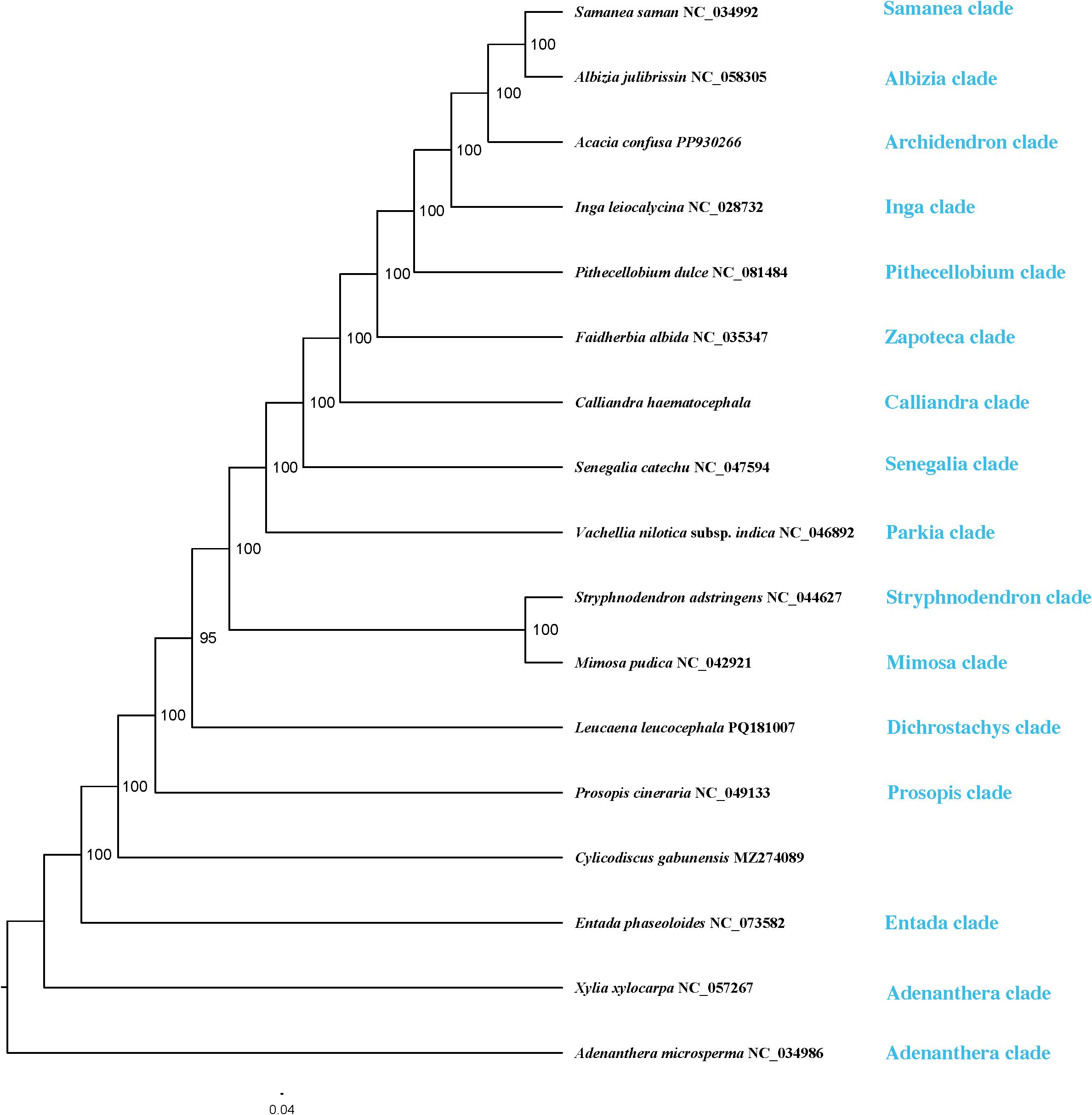 Eighty protein-coding genes (PCGs) were extracted from 17 plastomes of Mimoseae, aligned using MAFFT v7.487 (Katoh et al., 2002), and concatenated into a data matrix. Concurrently, a whole plastome alignment (designated as Full-Con) was constructed using MAFFT and PhyloSuite v1.2.2 (Zhang et al., 2020). Maximum likelihood (ML) trees were inferred from both matrices using RAxML v8.2.12 (Stamatakis, 2014) under the GTRGAMMA model with 1000 rapid bootstrap replicates.