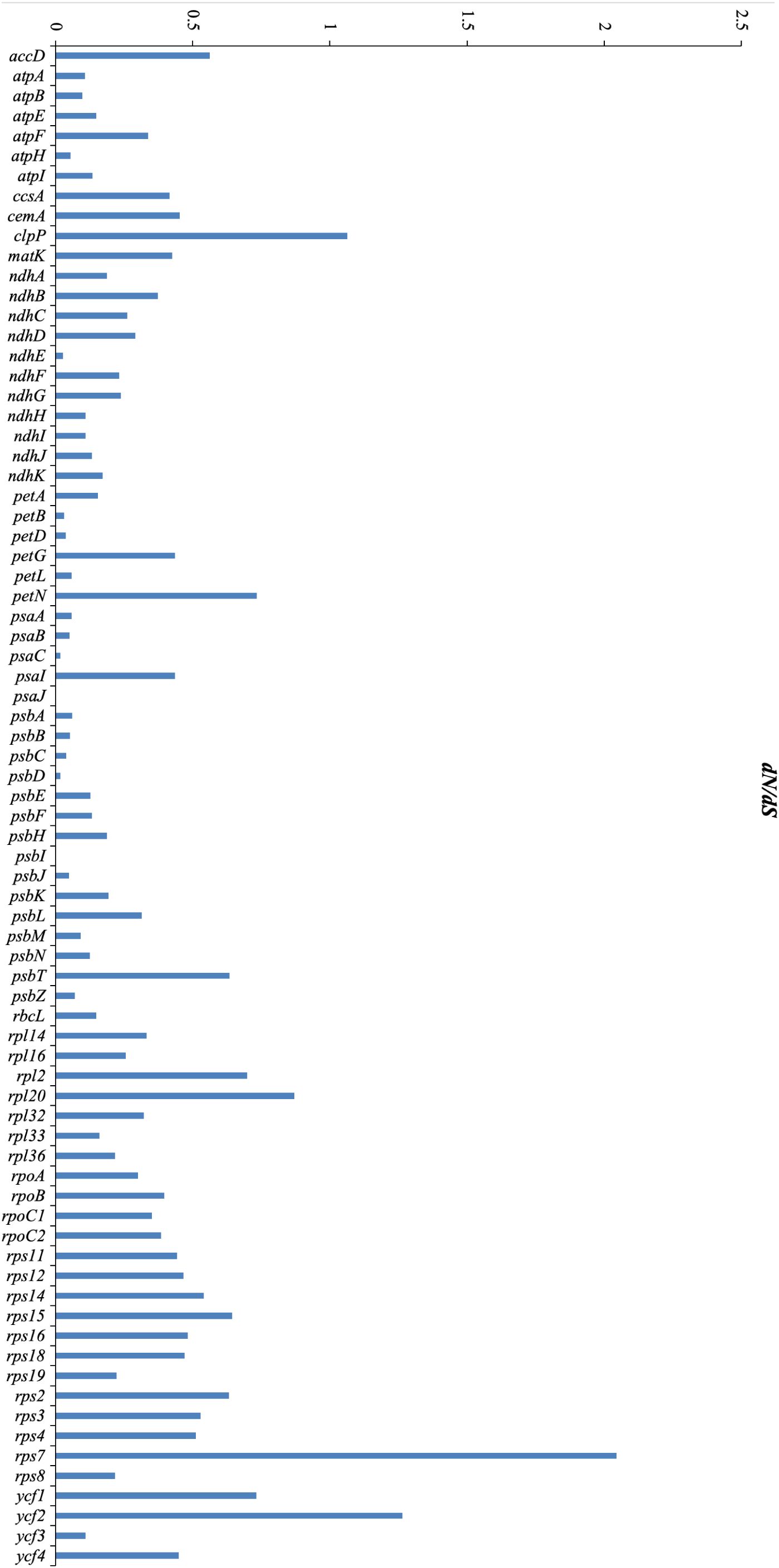 Figure 9. Distribution of non-synonymous/synonymous rate ratios (dN/dS ratios) for 76 protein-coding genes across 16 plastomes of the tribe Mimoseae.