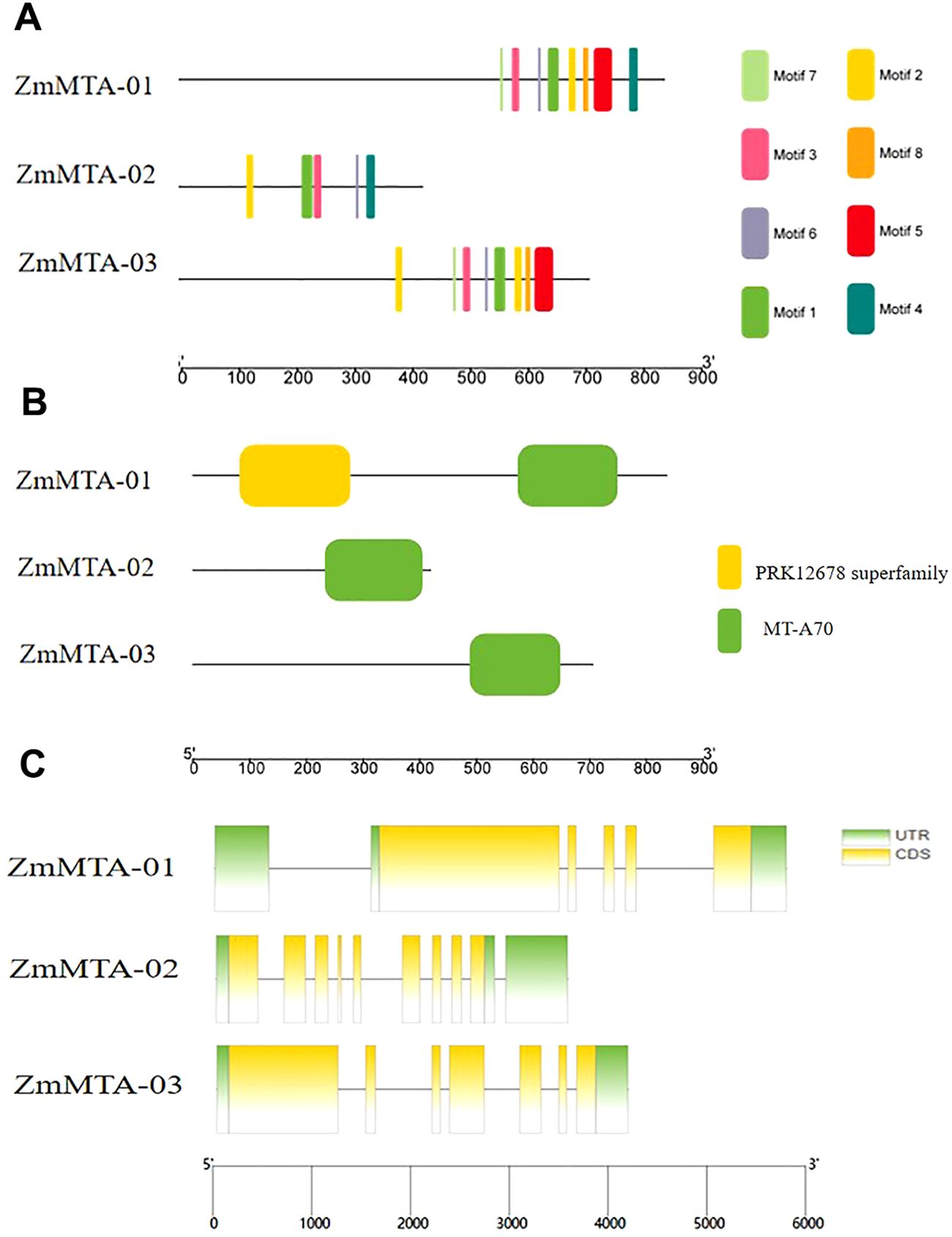 To identify the motifs present within each identified m6A protein. The motif analysis revealed that ZmMTA-01 and ZmMTA-03 contained all eight motifs, whereas ZmMTA-02 exhibited only five motifs. These results indicate significant variability in the presence of short motifs among the ZmMTA proteins (Figure 1A). The m6A methyltransferases in Arabidopsis are characterized by the presence of a conserved MT-A70 domain (Luo et al., 2022). Our analysis of the conserved domains in maize MTA gene family proteins demonstrated similarities to the AtMTA and OsMTA gene families, both of which also feature the highly conserved MT-A70 domain (Figure 1B). Furthermore, ZmMTA-01 contains a PRK12678 superfamily domain; the function of which remains to be discovered. These findings suggest that the maize m6A ZmMTAs possess fewer domains beyond the MT-A70, indicating potential functional redundancy among these proteins. Additionally, this study investigated the gene structure of the ZmMTA gene family, as visualized in Figure 1C. It was found that the gene family consists of 6 to 12 exons, with ZmMTA-01, ZmMTA-02, and ZmMTA-03 containing untranslated regions (UTRs) at both 5‘ and 3‘ ends.