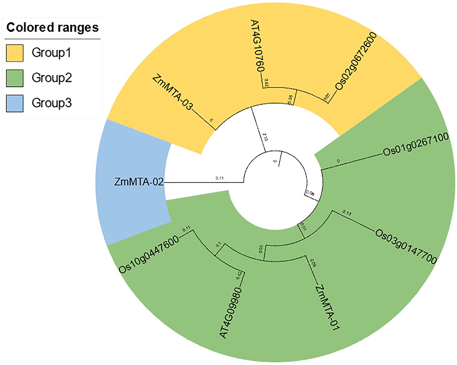A phylogenetic tree was constructed to analyze the m6A proteins from maize, rice, and Arabidopsis. This phylogenetic analysis involved three distinct clusters as groups, which included two proteins from Arabidopsis, four proteins from rice, and three proteins from maize. Group 1 includes one Arabidopsis MTA (AT4G10760) protein, one rice MTA (Os02g0672600), and one maize MTA (ZmMTA-03). Group 2 consists of one Arabidopsis MTA (AT4G09980), three rice MTAs (Os01g0267100), (Os03g0147700), (Os10g0447600), and one maize MTA (ZmMTA-01). Group 3 consists of only one maize MTA (ZmMTA-02) (Figure 2). Notably, except for (ZmMTA-02), the other two maize MTA proteins did not exhibit significant sequence divergence from AtMTA protein of Arabidopsis and OsMTA proteins of rice.