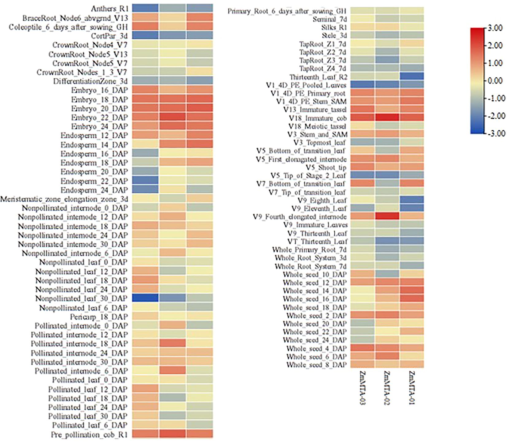 Figure 4. The analysis of tissue-specific expression of maize MTA genes indicated that higher expression levels are indicated by red boxes, while lower expression levels are denoted by blue boxes.