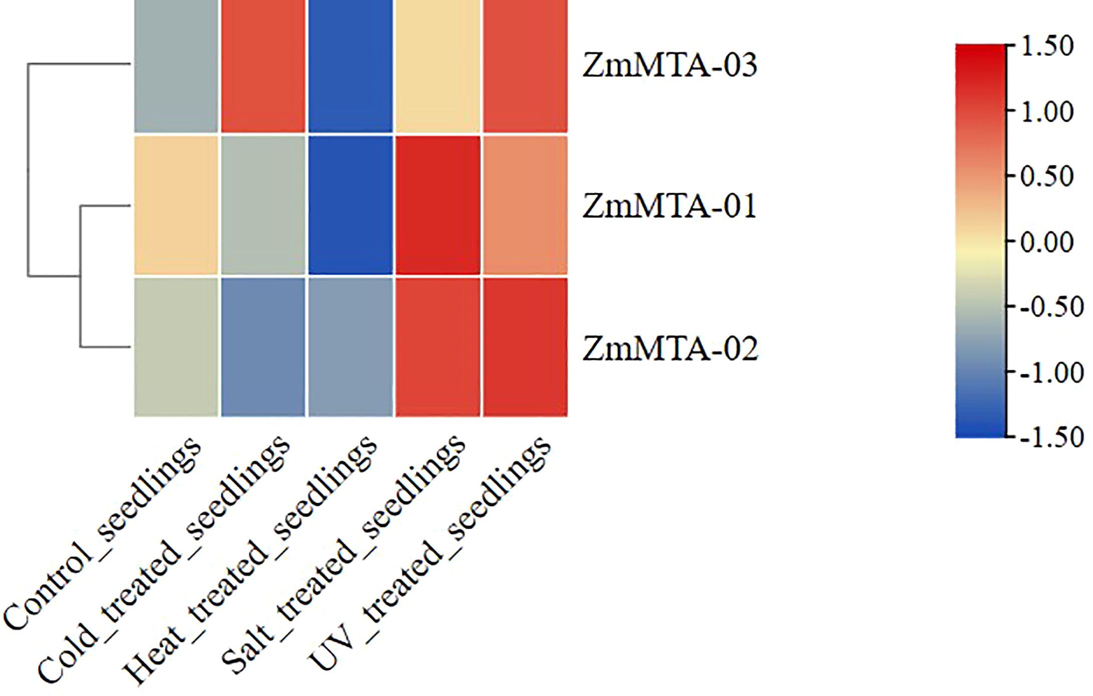 The expression characteristics of ZmMTA in response to environmental stressors were also investigated and illustrated (Figure 5). The expressions of ZmMTA-01 and ZmMTA-02 were comparable, exhibiting high expression levels under salt stress and ultraviolet irradiation, while the expression under cold and heat stress demonstrated lower levels. Conversely, the ZmMTA-03 gene showed a high expression level in response to ultraviolet irradiation and cold stress conditions, and a low expression level under heat stress. These findings indicate that the ZmMTA genes are sensitive to various environmental conditions and may be involved in the environmental response mechanism of maize, with functional differentiation observed among the three ZmMTA genes.