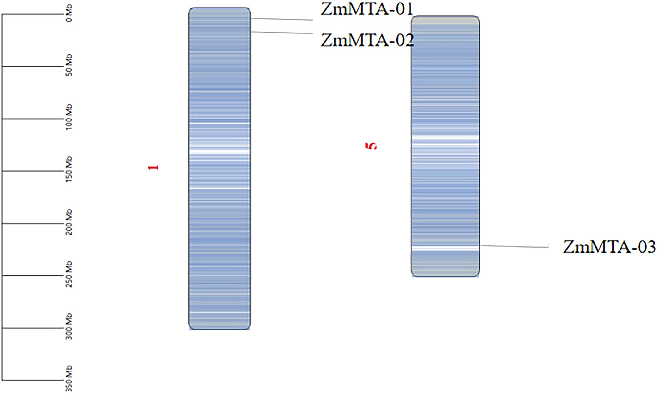 To elucidate the organization of the genome and the distribution of m6A-related genes in maize, a chromosomal map was constructed using TBtools. A total of three m6A-related genes were identified on the maize genome, in which ZmMTA-01 and ZmMTA-02 are located on chromosome 1, while ZmMTA-03 is on chromosome 5 (Figure 6). Our results revealed that the two ZmMTA genes are localized at the end of chromosome 1, and there is only one ZmMTA gene on chromosome 5. The gene duplicate identified in our study is comparable to that of m6A genes in Arabidopsis (2) and rice (4). This similarity indicates that the number of MTA genes in maize, Arabidopsis, and rice has been evolutionarily conserved.