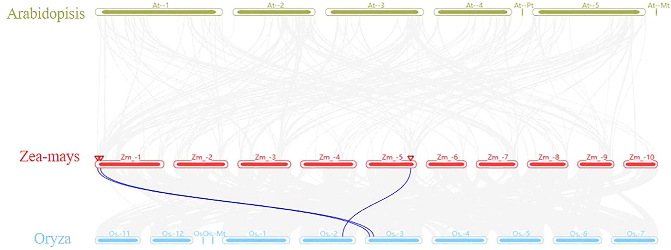 The chromosomal locations of the ZmMTA genes within the maize genome were determined based on their position, with coding sequences (CDS) data obtained and visualized using the GFF3 annotation file in TBtools. The genome assemblies of Zea mays, Arabidopsis thaliana, and Oryza sativa were employed to visualize synteny and collinearity, which were examined through a multi-synteny plot generated using the one-step MCScanX program in TBtools (Chen et al., 2020).