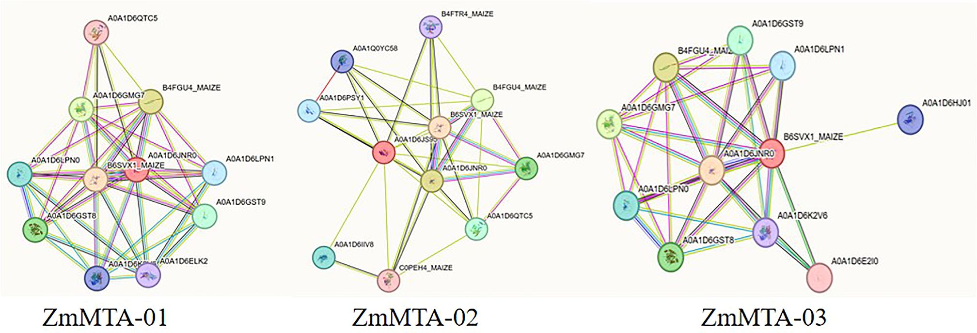 To enhance the understanding of the ZmMTAs protein family and their structural characteristics, a three-dimensional (3D) model was generated based on three ZmMTA genes (Figure 8). The 3D structures of ZmMTA-01 and ZmMTA-03 exhibit notable similarities, particularly in their core regions. Furthermore, we investigated the gene interaction network utilizing the STRING database. The results revealed that ZmMTA-01 interacts with proteins such as B6SVX1_MAIZE, B4FGU4_MAIZE, and A0A1D6GMG7. Whereas ZmMTA-02 show interactions with B6SVX1_MAIZE, A0A1D6JNR0, and B4FGU4_MAIZE. ZmMTA-03 demonstrated significant associations with proteins such as A0A1D6JNR0, B4FGU4_MAIZE, and A0A1D6GMG7 (Figure 9). Notably, among these interactions, the relationship between ZmMTA-03 and A0A1D6JNR0 is particularly significant. The A0A1D6GMG7 plays a crucial role in embryonic development. These findings suggest that ZmMTAs are involved in reproductive developmental processes.