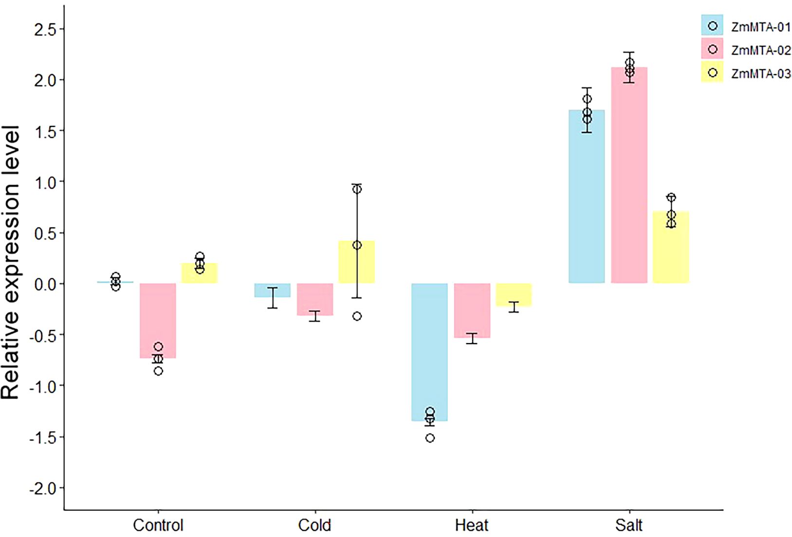 It has been well documented that the m6A-modifier genes are involved in plant response to abiotic and biotic stress, particularly in response to cold, heat, and salt (Li et al., 2025). To investigate the expression patterns of m6A-related genes in maize under abiotic stress, we selected three genes, namely ZmMTA-01, ZmMTA-02, and ZmMTA-03, and examined their expression patterns by RT-qPCR after exposure to cold, heat, and NaCl stress. The RT-qPCR results revealed that the expression of most m6A-related genes shows a tendency consistent with the transcript abundance observed in RNA-seq. Under cold stress, ZmMTA-01 expression was significantly downregulated, while ZmMTA-03 was highly upregulated (Figure 10). Consequently, ZmMTA-02 shows moderate downregulation in response to cold stress. Heat stress consistently reveals the downregulation of all selected genes, showing the most pronounced expression. The expression patterns of ZmMTA-01 and ZmMTA-02 under salt stress (NaCl) were highly upregulated, thus ZmMTA-02 showing slightly higher expression than ZmMTA-01. Furthermore, the expression of ZmMTA-03 under salt stress was also positive but was less pronounced compared to other genes. These results underscore that RT-qPCR confirmed the three genes are differentially regulated in response to abiotic stress.