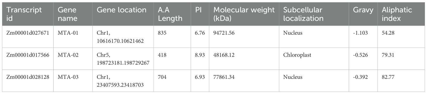 To identify the homologs of Atm6As and Osm6As in maize, a BLAST and CD-search analysis was conducted. Following the alignment of sequences and the conformation of conserved domains, three genes were identified and aligned with the maize genome, subsequently renamed as ZmMTA-01, ZmMTA-02, and ZmMTA-03 as detailed in Table 1. The physicochemical properties and subcellular localization analysis of the ZmMTA family proteins were examined utilizing the ExPASY proteomic online tool. The ZmMTAs genes in maize encode proteins are characterized by diverse amino acid compositions, physicochemical properties, distributions, number of amino acids, molecular weights, isoelectric points, fat coefficients, and average hydrophobicity, as summarized in Table 2. Overall, ZmMTA-01 has the highest amino acid content, while ZmMTA-02 has the lowest. The fat coefficient of ZmMTA proteins ranges from 50 to 80, indicating higher stability. In maize, the hydrophobicity analysis of m6A-modified proteins indicates negative values, suggesting that the ZmMTA family comprises exclusively hydrophilic proteins. Subcellular localization reveals that ZmMTA-01 and ZmMTA-03 are localized in the nucleus, whereas ZmMTA-02 is associated with the chloroplast. This localization pattern implies that the primary function of the ZmMTA protein is within the cell nucleus. Additionally, given that chloroplasts possess their own independent DNA capable of replication and transcription. The presence of ZmMTA protein in chloroplasts may suggest a regulatory role that influences both the development and photosynthetic functions of these organelles (Maple and Møller, 2007).