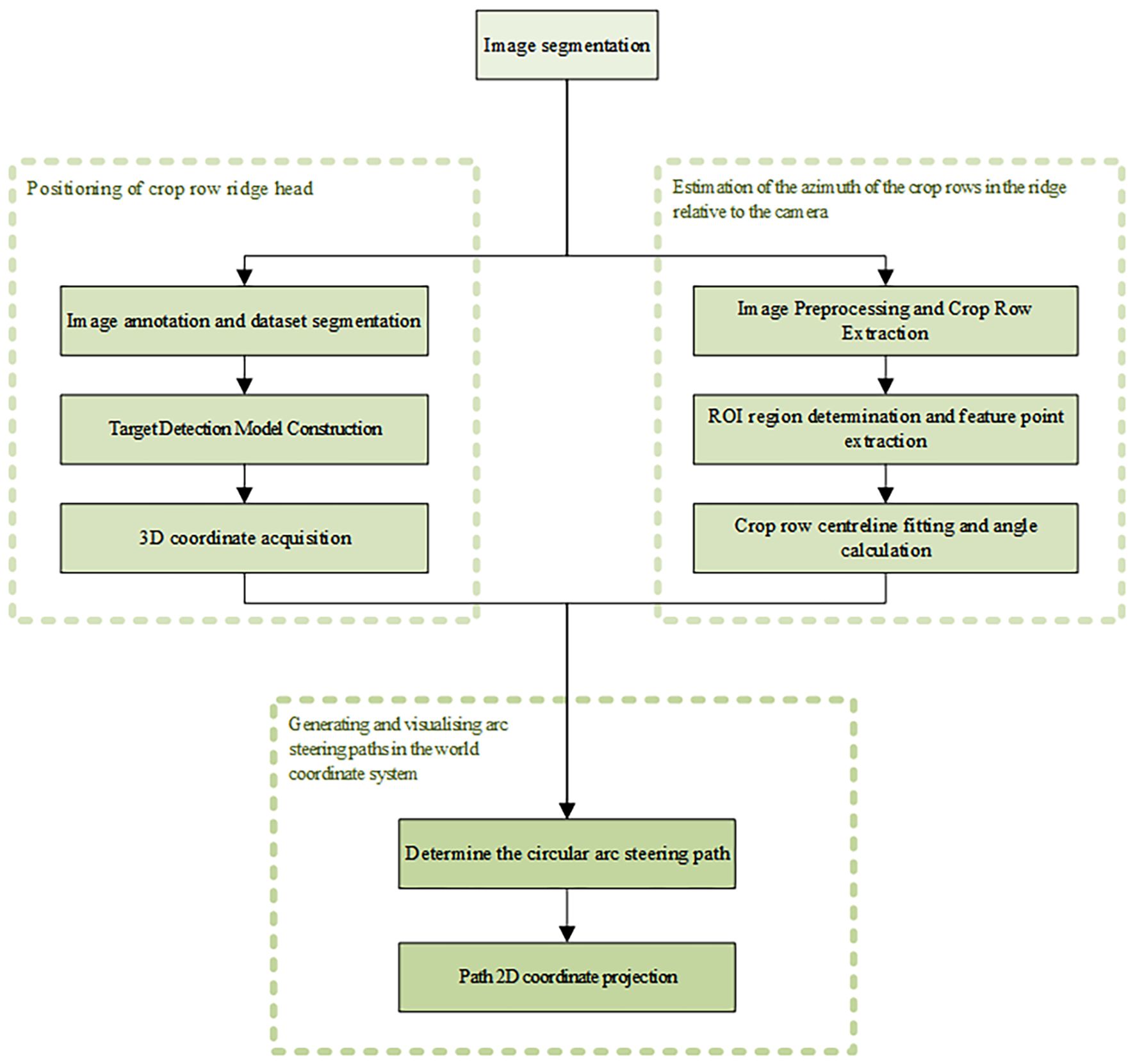 This study used PyCharm software for algorithm development, combined with computer vision technology, to complete the arc steering path visualization study. The overall algorithmic process was divided into three main parts: crop row headland positioning, estimation of the relative azimuth angle between crop rows in the ridge and the camera, and generation of the arc turning path in the world coordinate system with visualization.